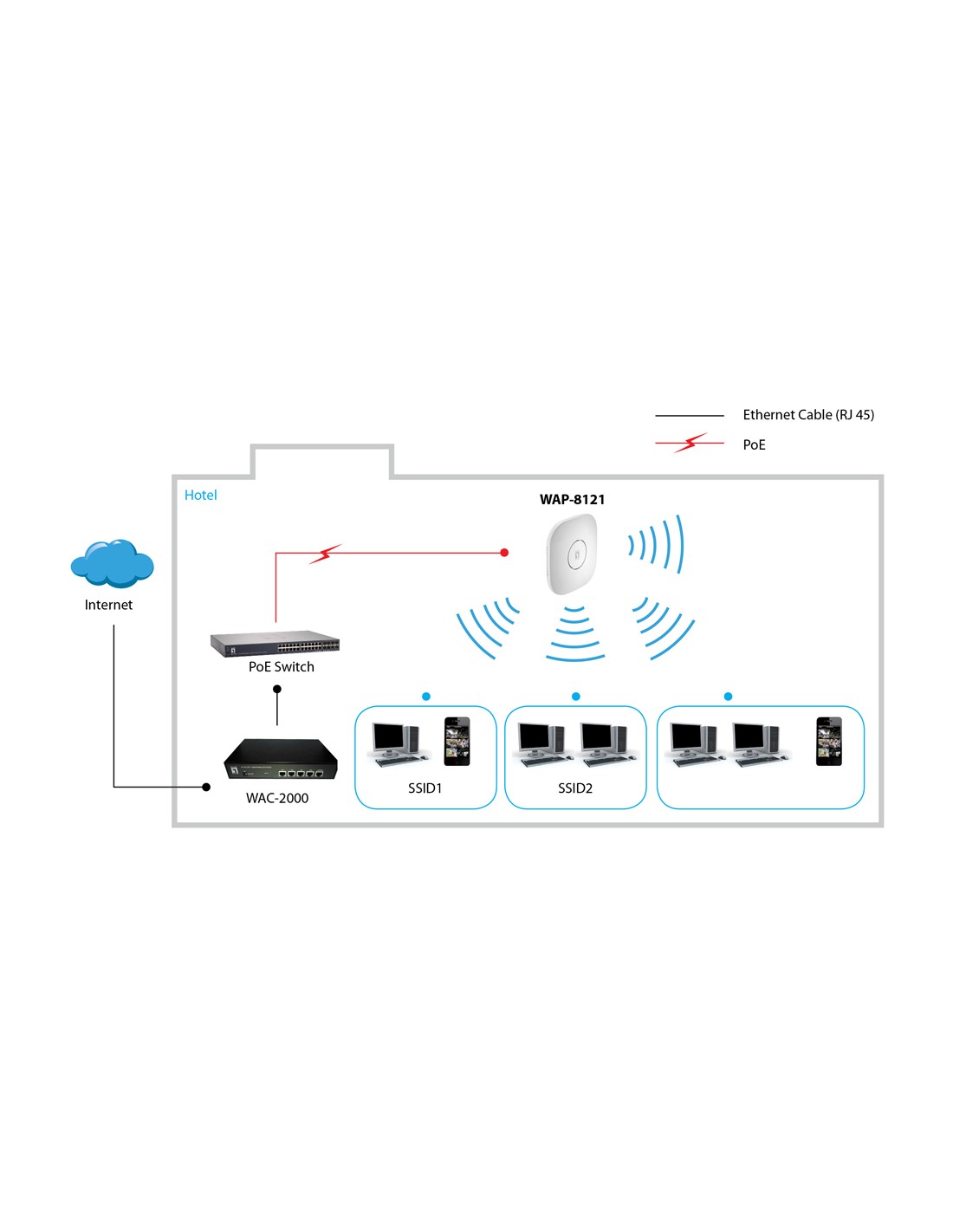 LevelOne WAP-8121. Velocità massima di trasferimento dati: 433 Mbit/s, Velocità trasferimento Ethernet LAN: 10,100,1000 Mbit/s, Banda di frequenza: 2.4 - 5.825 GHz. Algoritmi di sicurezza supportati: 64-bit WEP,128-bit WEP,WPA,WPA2,WPA2-AES,WPA2-PSK,WPA2-TKIP, Funzioni SSID (Service Set Identifier): Attivazione/disattivazione della trasmissione SSID. Tipo interruttore: Gestito. Porta WAN: Ethernet (RJ-45), Wi-Fi. Voltaggio di uscita: 12 V, Corrente d'uscita: 1,5 A, Consumi: 15 W