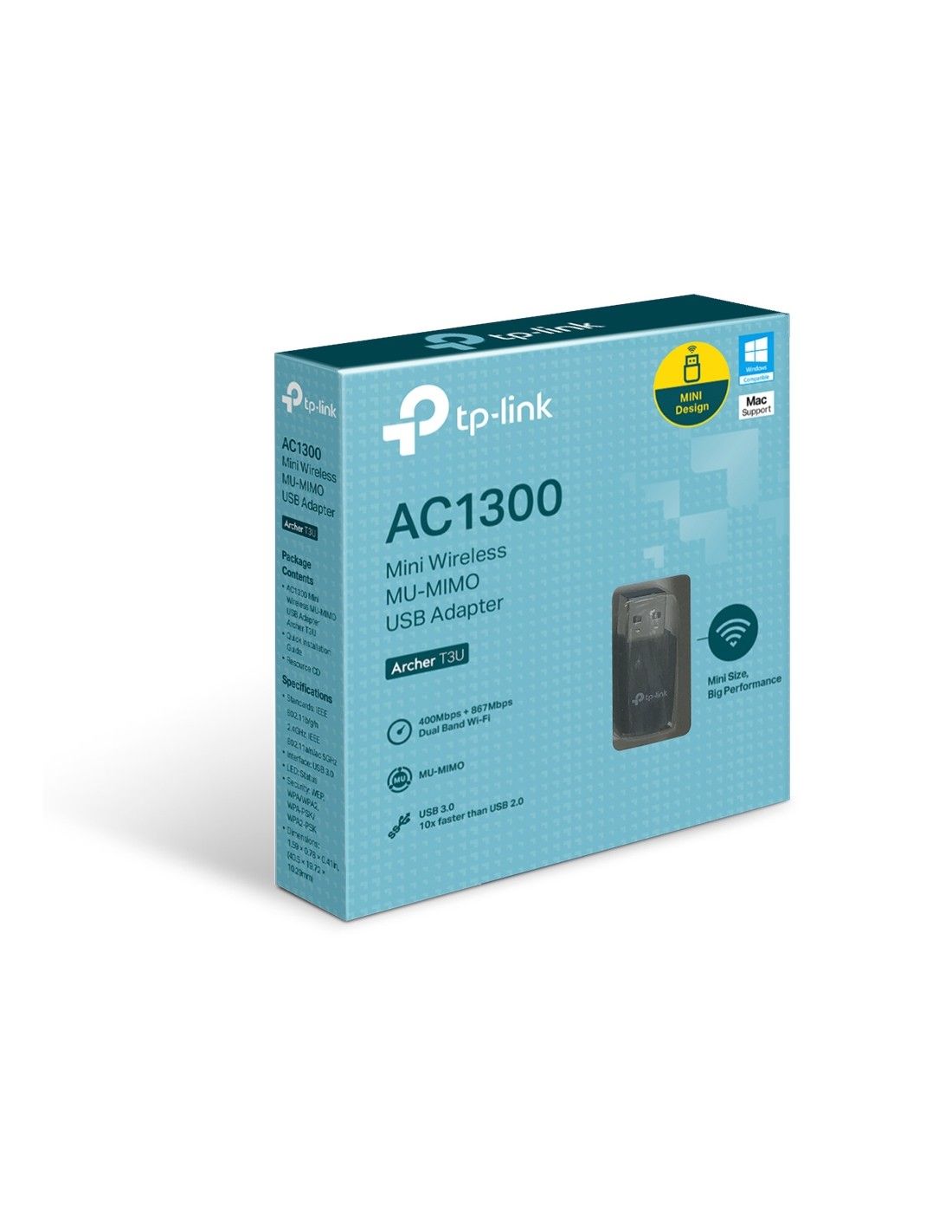 TP-LINK Archer T3U. Tecnologia di connessione: Cablato, Interfaccia host: USB, Interfaccia: WLAN. Velocità massima di trasferimento dati: 1267 Mbit/s, Wi-Fi standard: Wi-Fi 5 (802.11ac). Tipo di antenna: Interno. Alimentazione USB. Colore del prodotto: Nero