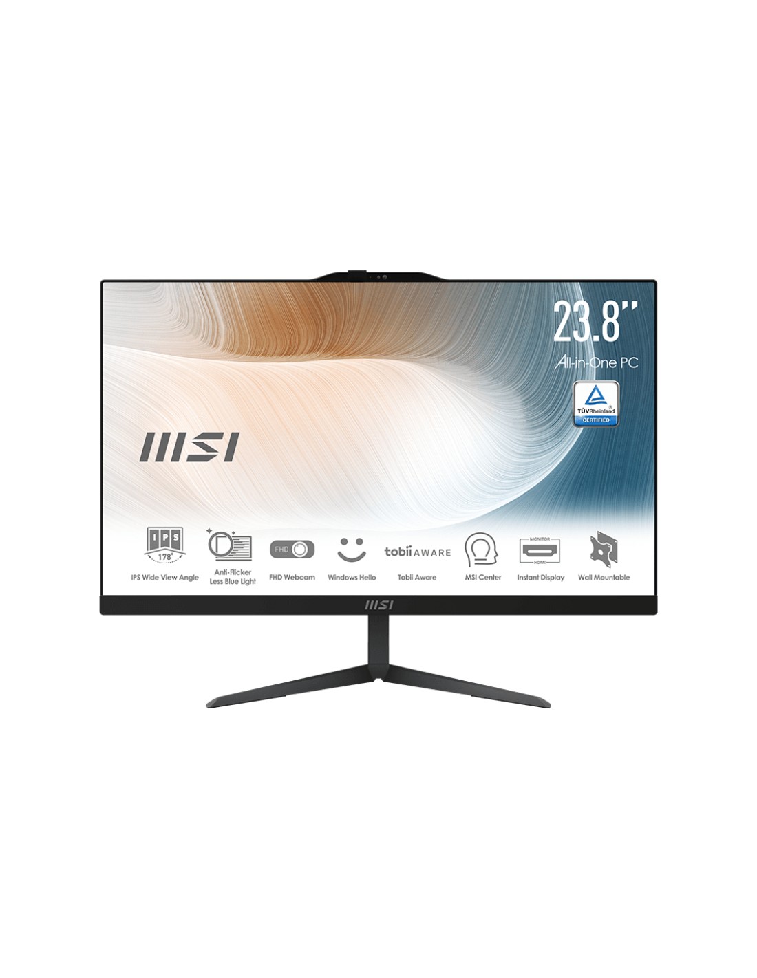 MSI Modern AM242 12M-638IT. Tipo di prodotto: PC All-in-one. Dimensioni diagonale schermo: 60,5 cm (23.8"), Tipologia HD: Full HD, Risoluzione del display: 1920 x 1080 Pixel, Tipo di pannello: IPS. Famiglia processore: Intel® Core™ i5. RAM installata: 8 GB, Tipo di RAM: DDR4-SDRAM. Capacità totale di archiviazione: 512 GB, Supporto di memoria: SSD. Modello scheda grafica integrata: Intel Iris Xe Graphics. Sistema operativo incluso: Windows 11 Pro. Colore del prodotto: Nero