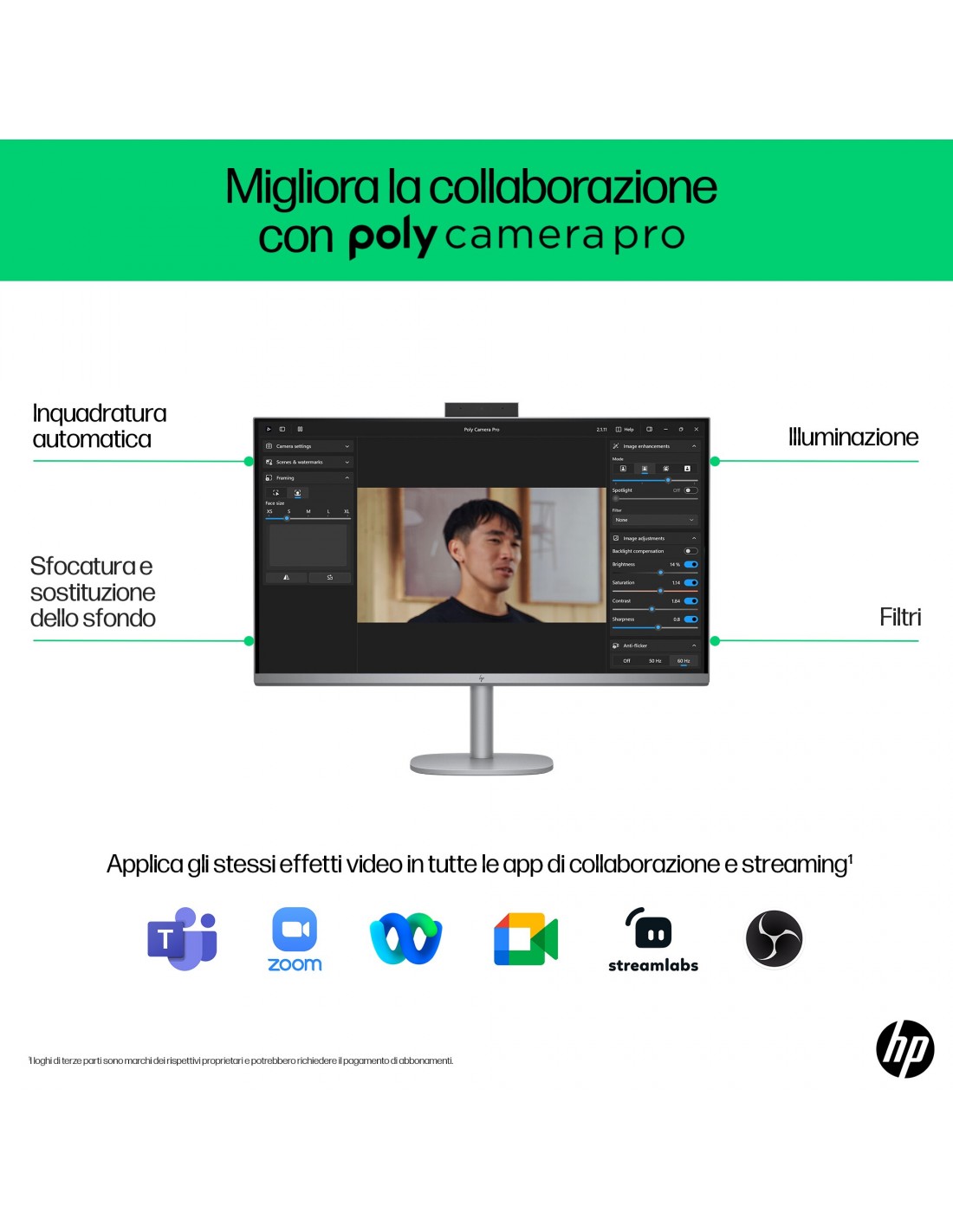 Affronta le attività più impegnative con il PC desktop all-in-one HP OmniStudio X da 31,5'' e il potente processore Intel Core™ Ultra[1]. Visualizza immagini coinvolgenti su un display 4K[2] con connettività ultraveloce, e passa in un attimo dal lavoro al divertimento grazie alle funzionalità per il comfort e il benessere basate sull'AI.