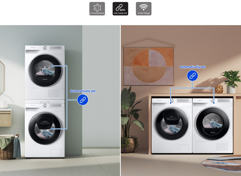 Smart LinkLavatrice e asciugatrice sempre connesse La lavatrice comunica con l'asciugatrice impostando direttamente il programma di asciugatura ideale in base al ciclo di lavaggio appena concluso. Il programma di lavaggio Cotone si è appena concluso? Ai Control si collega direttamente all'asciugatrice e imposta il programma di asciugatura ideale (Cotone).