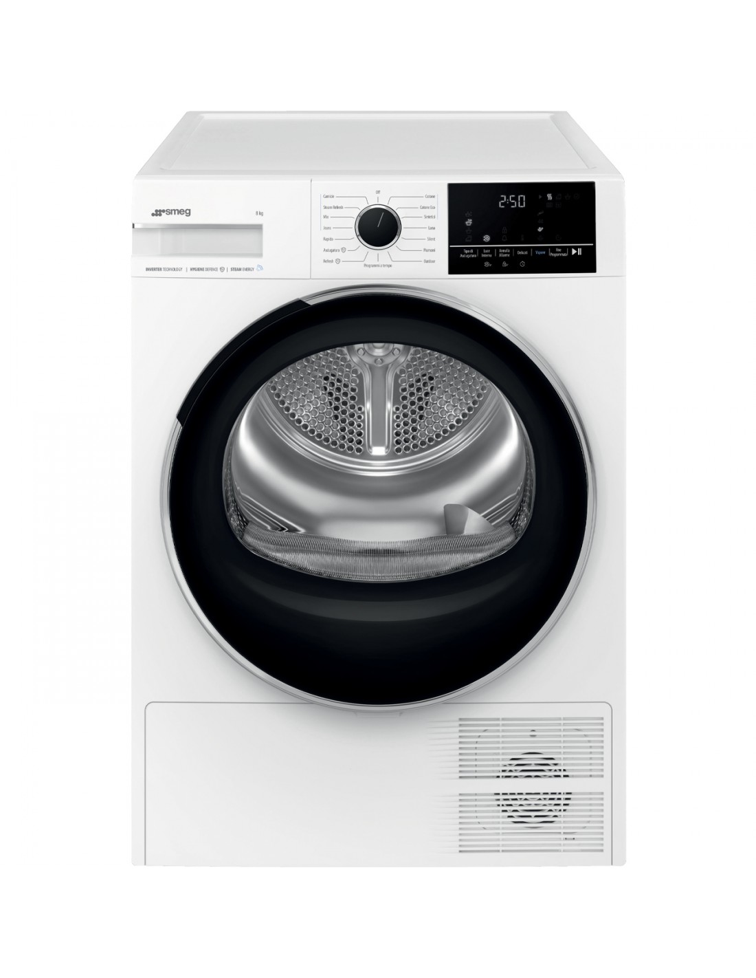 Smeg DNP08SEB. Posizionamento dell'apparecchio: Libera installazione, Tipo di carica: Caricamento frontale, Sistema di asciugatura: Pompa di calore. Capacità cestello: 8 kg, Classe di efficienza della condensazione: B, Programmi di asciugatura: Camicia/maglietta, Cotone, Cotton eco, Piumino/piumone, Hygienic drying, Hygienic freshen-up,.... Partenza ritardata: 24 h. Classe efficienza energetica: B, Consumo energetico per 100 cicli: 85 kWh, Consumo energetico: 0,85 kWh. Profondità: 671 mm, Larghezza: 598 mm, Altezza: 846 mm