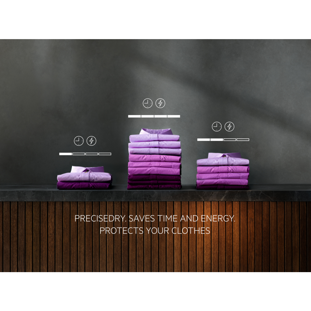 Gli avanzati sensori di umidità della tecnologia PreciseDry aiutano a risparmiare tempo ed energia, ottimizzandoli in base carico. Fornisce la giusta cura a ogni tessuto, mantenendolo perfetto e come appena comprato.