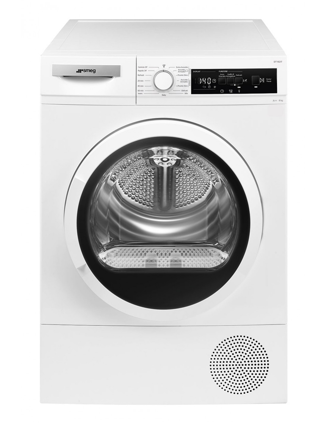 Smeg DT1T08E. Posizionamento dell'apparecchio: Libera installazione, Tipo di carica: Caricamento frontale, Sistema di asciugatura: Pompa di calore. Capacità cestello: 8 kg, Classe di efficienza della condensazione: C, Programmi di asciugatura: 40min, Cura del bambino, Cotone, Delicati/Seta, Jeans/denim, Mix, Rapido, Refresh, Shirts, Sintetico. Classe efficienza energetica: E, Consumo energetico per 100 cicli: 144 kWh, Consumo energetico: 1,44 kWh. Profondità: 525 mm, Larghezza: 596 mm, Altezza: 845 mm