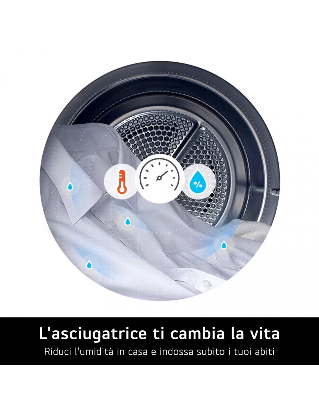 L'asciugatrice è in grado di rilevare l'umidità dei tessuti in modo da ottimizzare i tempi di asciugatura e i consumi. Inoltre, puoi decidere il grado di asciugatura a seconda di cosa devi fare successivamente. L'asciugatura 'pronto stiro' manterrà un minimo grado di umidità per permetterti di stirare i vestiti più comodamente, mentre quella 'pronto armadio' li asciugherà completamente in modo da poterli riporre subito nel guardaroba.