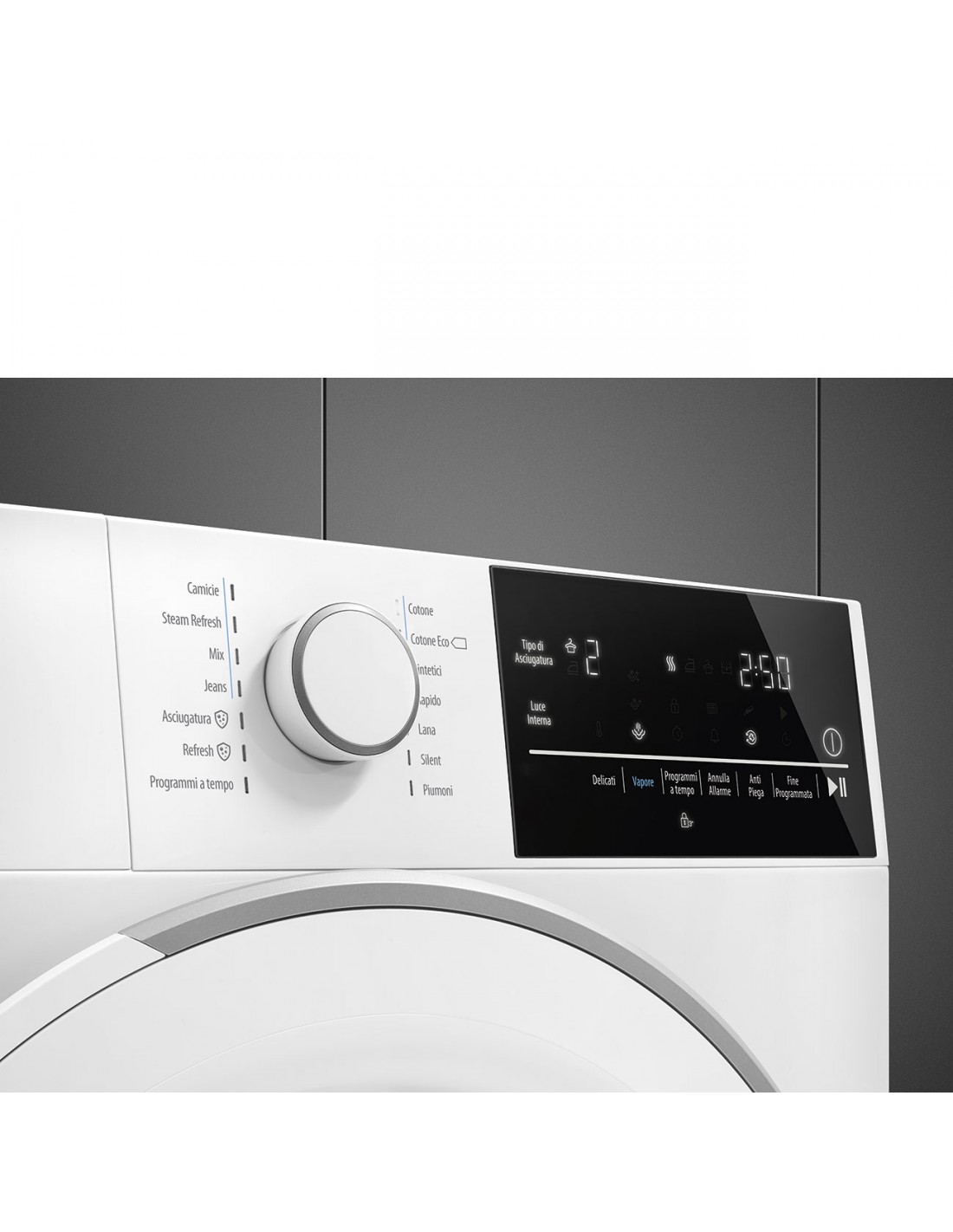 | Programmi di asciugatura | Camicia/maglietta, Cotone, Eco, Igiene/Allergy Care, Jeans/denim, Mix, Rapido, Refresh, Silent, Vapore, Sintetico, Lana |