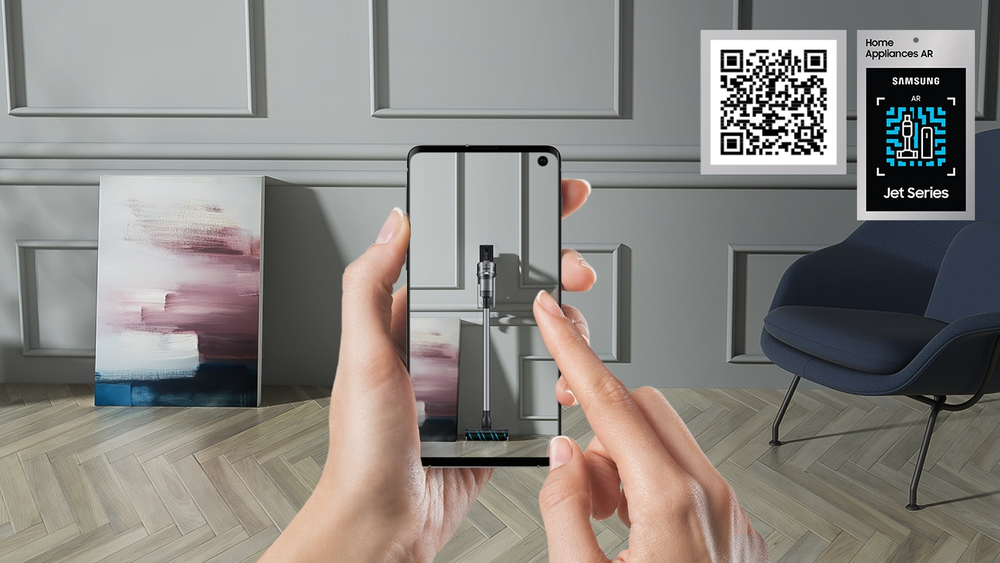 Passaggio 1 | Scansiona il codice QR e installa l'app SAMSUNG HA AR da Google Play Store. Passaggio 2 | Apri l'app e seleziona la serie Jet da scaricare. Passaggio 3 | Scansiona l'indicatore AR per sperimentare la tecnologia Jet"