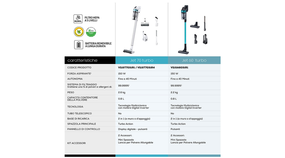 Il sistema Jet Turbo Brush raccoglie anche le più piccole particelle di polvere sia sui tappeti che sui pavimenti. La testa ruota di 180° per cambiare facilmente direzione e pulire fin negli angoli. Inoltre, basta un gesto per staccare la spazzola e pulirla, mantenendo un’igiene impeccabile.