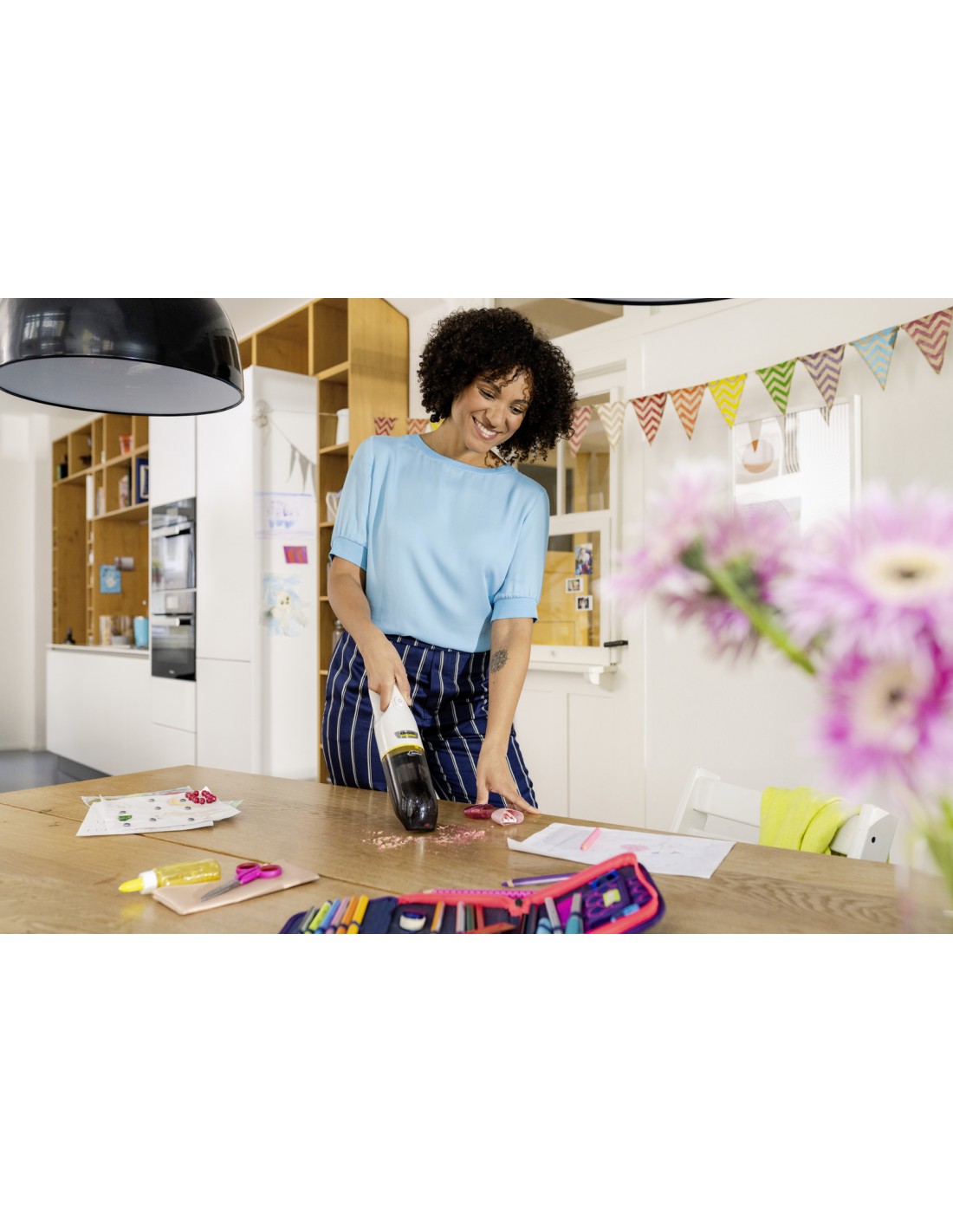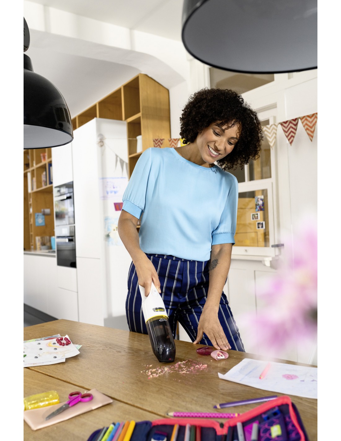 Un potente alleato per tutti i giorni: l'aspirabriciole CVH 3 Plus, alimentato a batteria, rimuove efficacemente ogni tipo di sporco, come capelli, briciole e polvere, ovunque e senza lasciare residui. Inoltre, il sistema filtrante lavabile a due fasi, composto da una rete in acciaio fine per sporco grossolano e capelli e da un filtro HEPA a valle (EN 1822:1998), garantisce un'aria di scarico estremamente pulita. Altre caratteristiche sono: elevata potenza di aspirazione e maggiore durata grazie al silenzioso motore BLDC, design compatto e leggero, due diversi livelli di aspirazione con un'autonomia della batteria fino a 20 minuti e una comoda stazione di ricarica che include un vano per gli accessori.