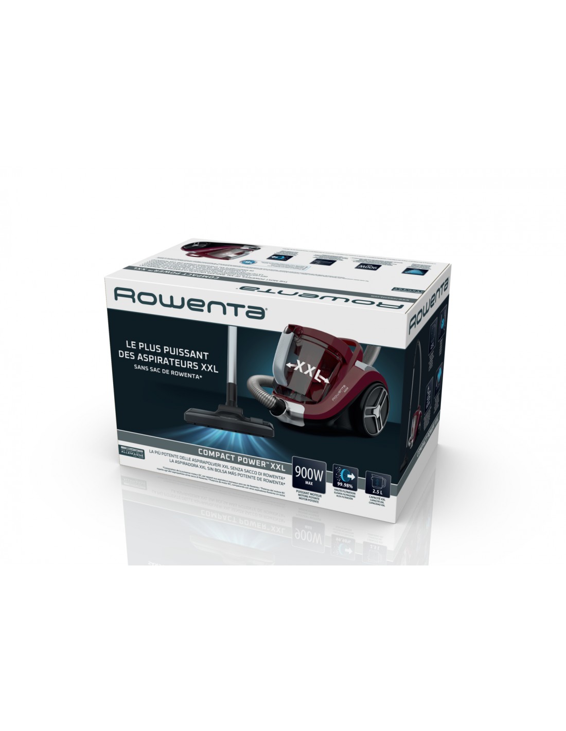 Rowenta Compact Power XXL RO4B63. Massima potenza in entrata: 900 W. Tipo: A cilindro, Tipo di pulizia: Secco, Tipo di contenitore della polvere: Senza sacchetto, Capacità del contenitore: 2,5 L. Metodo di separazione dello sporco: Filtro, Emissione acustica: 75 dB. Colore del prodotto: Rosso