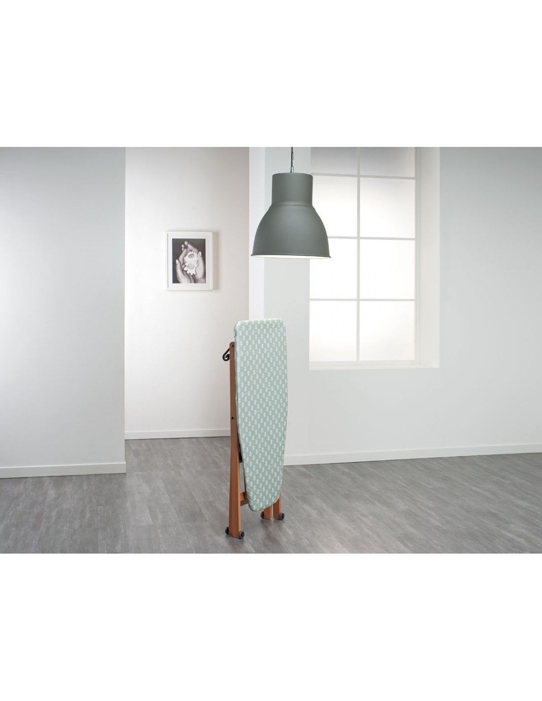 L'asse da stiro in legno Assai di Foppapedretti, con struttura in legno massiccio, quando è chiusa occupa pochissimo spazio, sta in piedi da sola e si sposta facilmente grazie alle ruote antigraffio.
