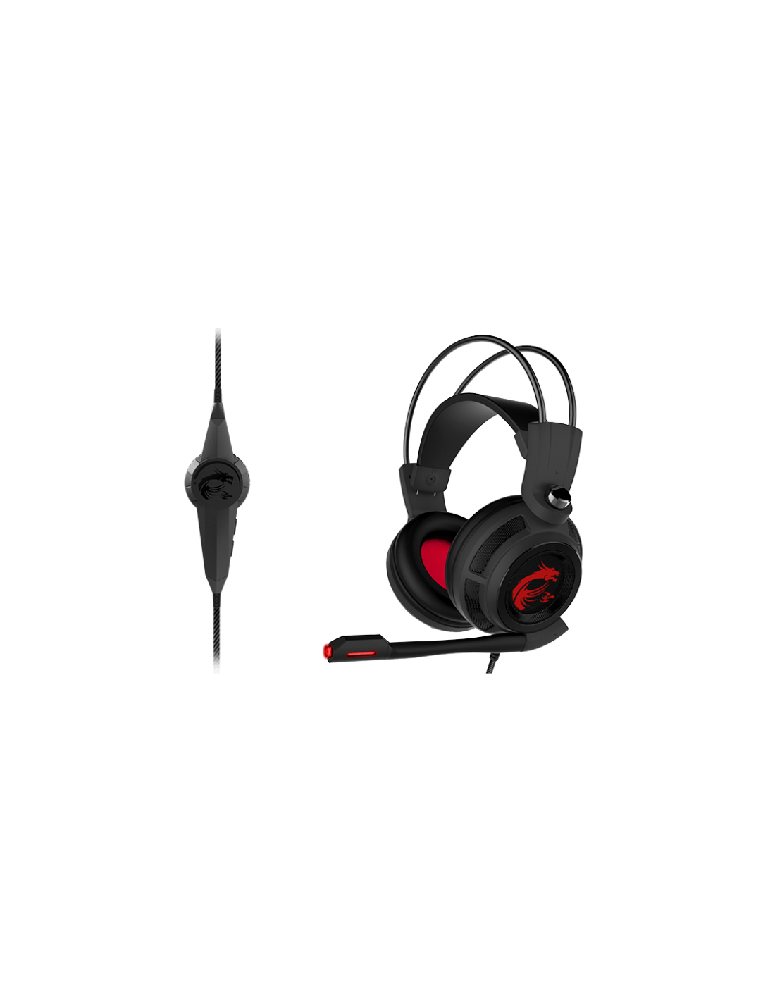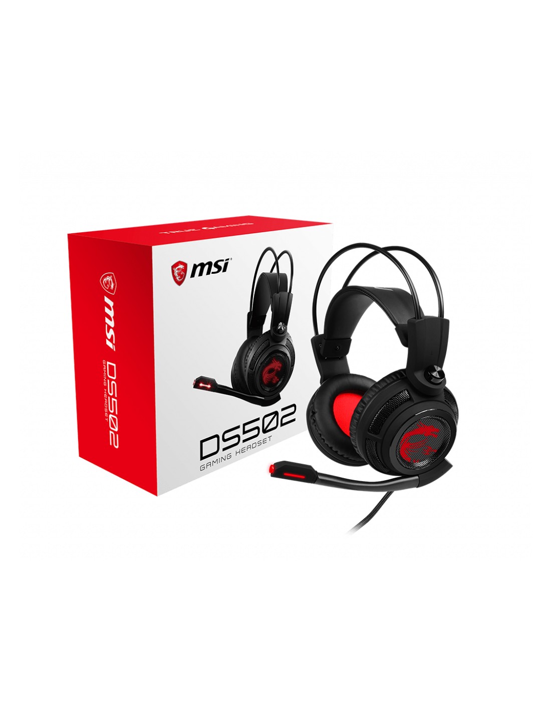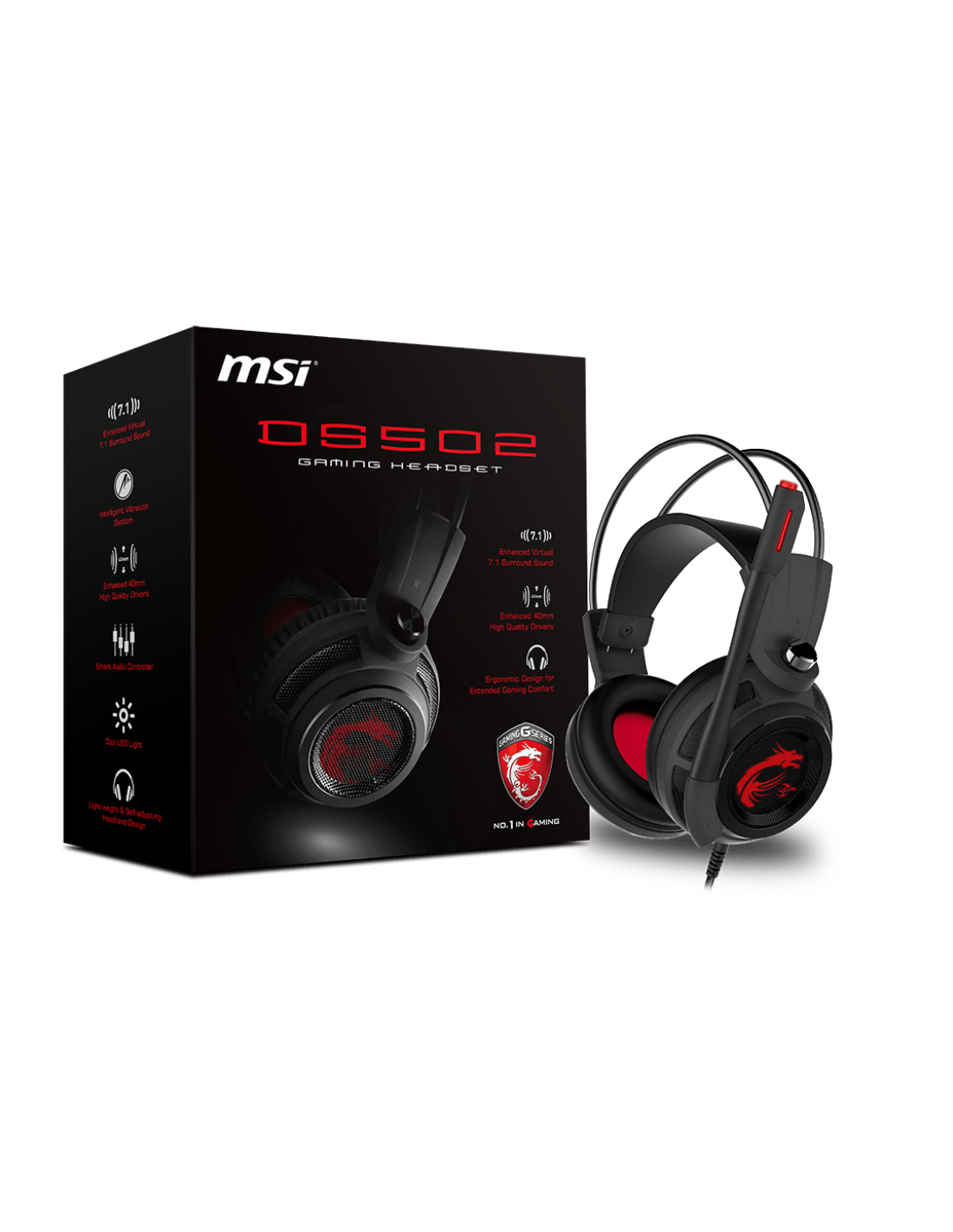 MSI DS502. Tipo di prodotto: Auricolare. Tecnologia di connessione: Cablato. Utilizzo raccomandato: Gaming. Frequenza cuffia: 20 - 20000 Hz. Lunghezza cavo: 2 m. Peso: 405 g. Colore del prodotto: Nero, Rosso