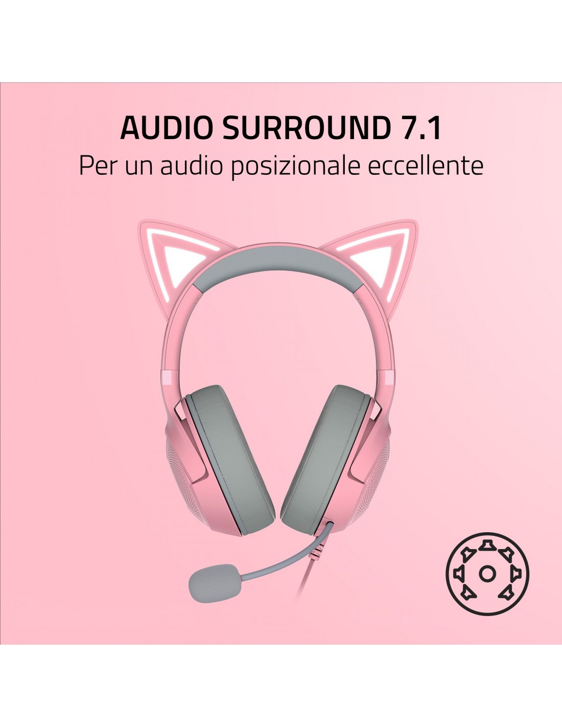 Razer Kraken Kitty V2 - Quartz ed. Cuffia Cablata a padiglione Rosa. Tipo di prodotto: Auricolare. Tecnologia di connessione: Cablato. Utilizzo raccomandato: Musica e Chiamate, Lunghezza cavo: 1,3 m. Peso: 353 g. Colore del prodotto: Rosa