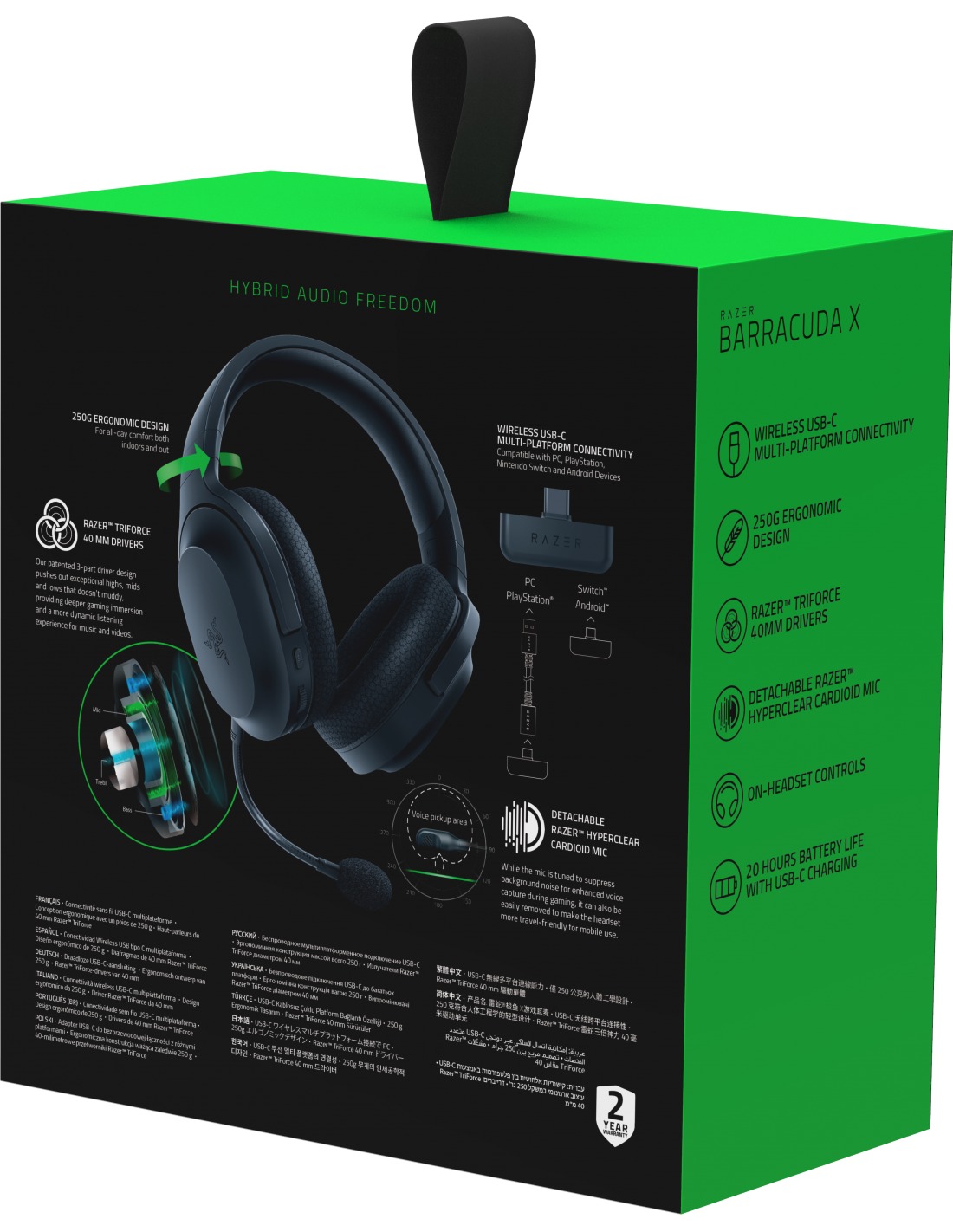 Razer BARRACUDA X. Tipo di prodotto: Cuffie. Tecnologia di connessione: Con cavo e senza cavo. Utilizzo raccomandato: Gaming. Frequenza cuffia: 20 - 20000 Hz. Lunghezza cavo: 1,5 m. Peso: 250 g. Colore del prodotto: Nero