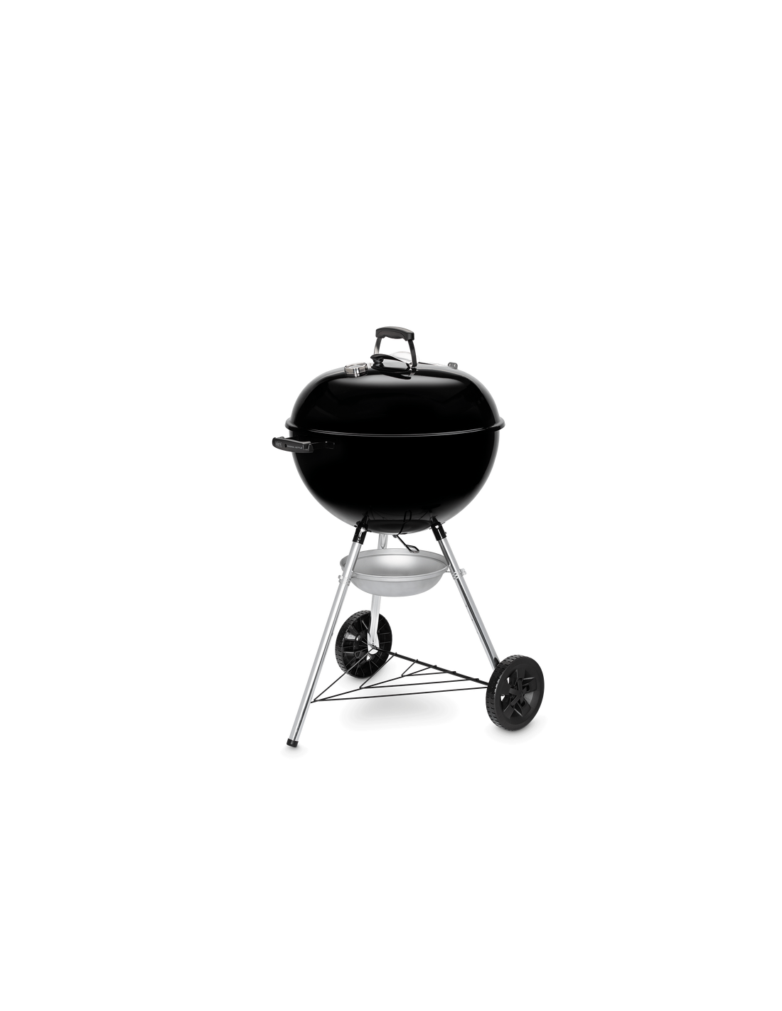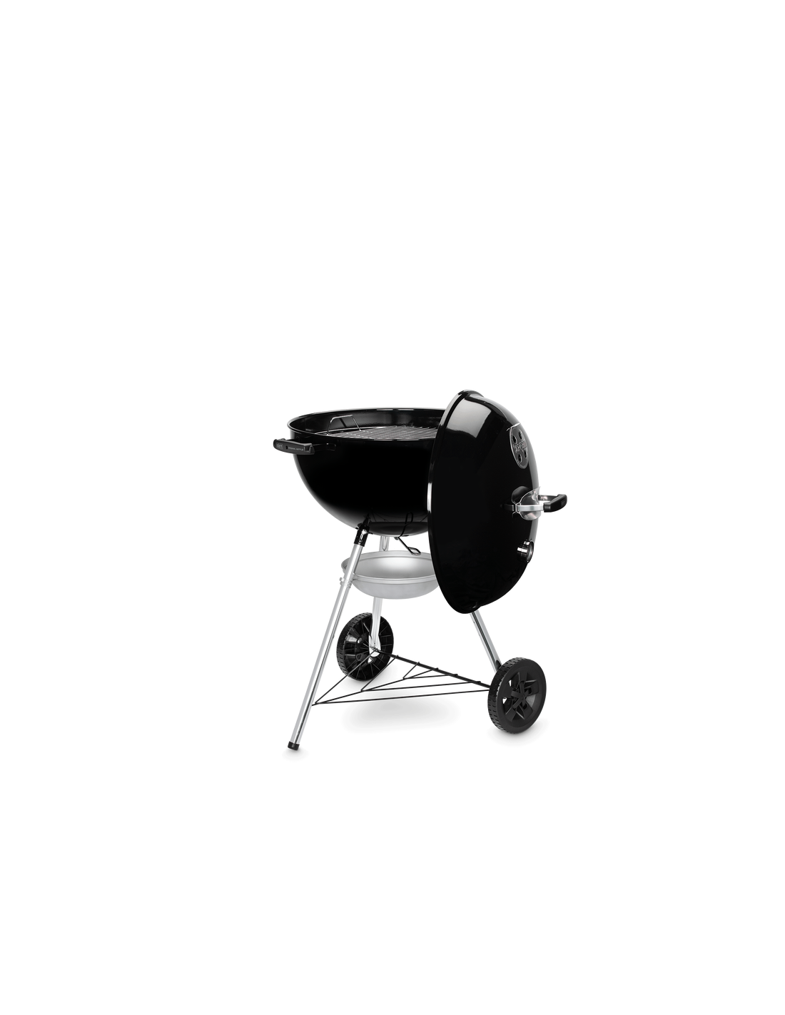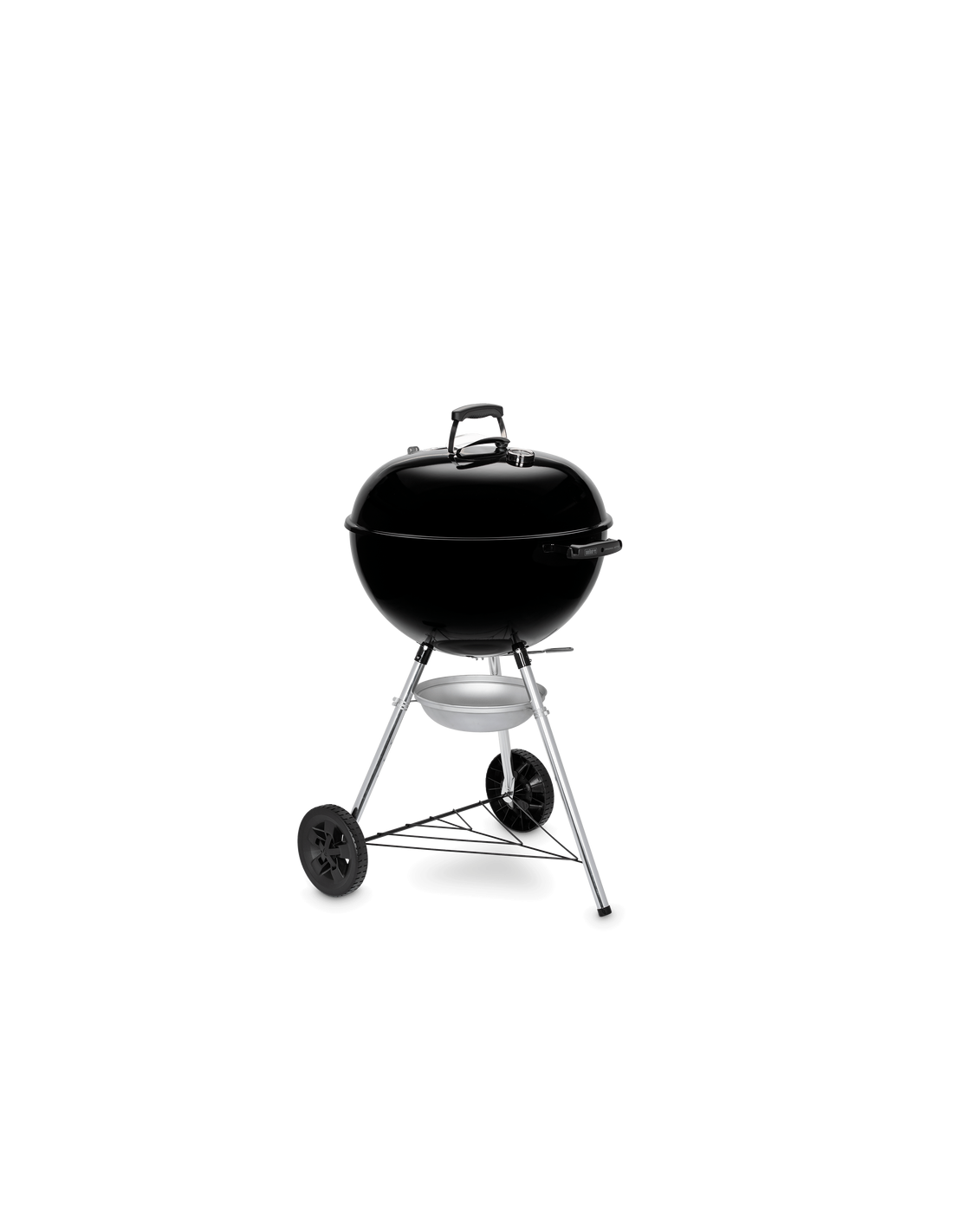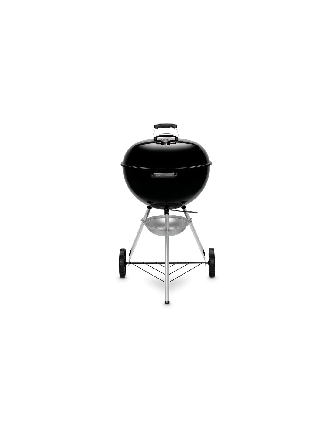Barbecue a carbone con griglia di cottura da 57 cm. Braciere e coperchio in acciaio smaltato, impugnature in nylon rinforzato con fibre di vetro e valvola d'areazione in alluminio. Griglia di cottura in acciaio cromato, griglia focolare in acciaio. Termometro integrato. Peso 14 Kg.