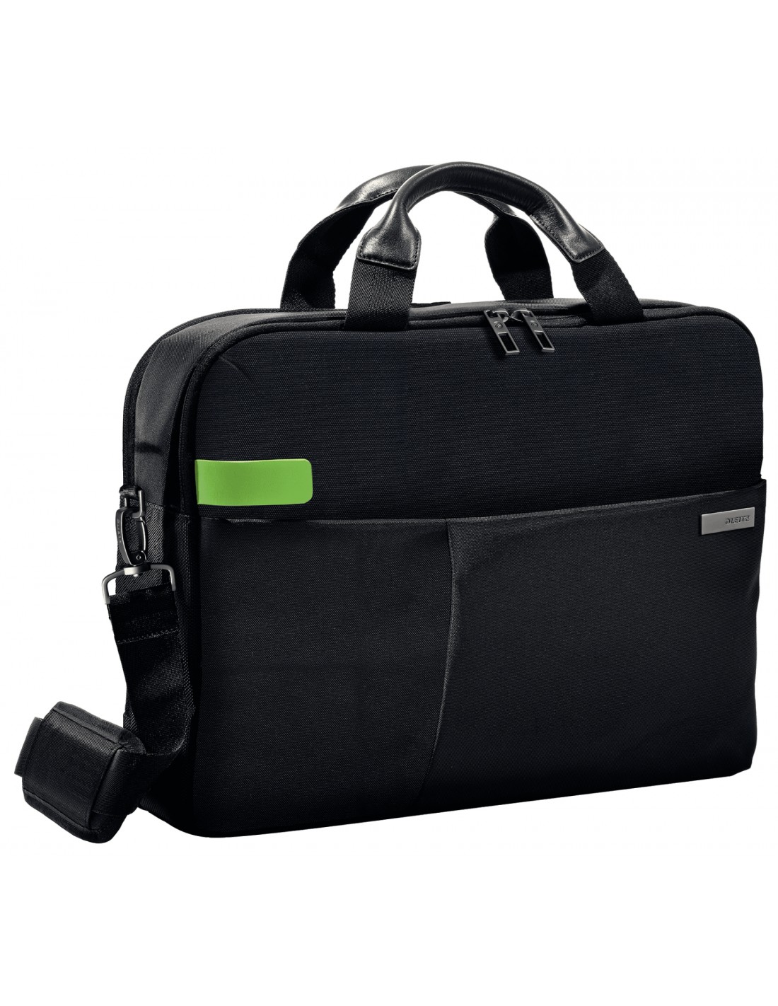 Borsa business leggera con due scomparti principali e uno scomparto anteriore più piccolo. Design elegante e distintivo con chiusura a zip intelligente ed eleganti fibbie in metallo opaco. Maniglie imbottite in vera pelle, tracolla regolabile o fascia di fissaggio al trolley.