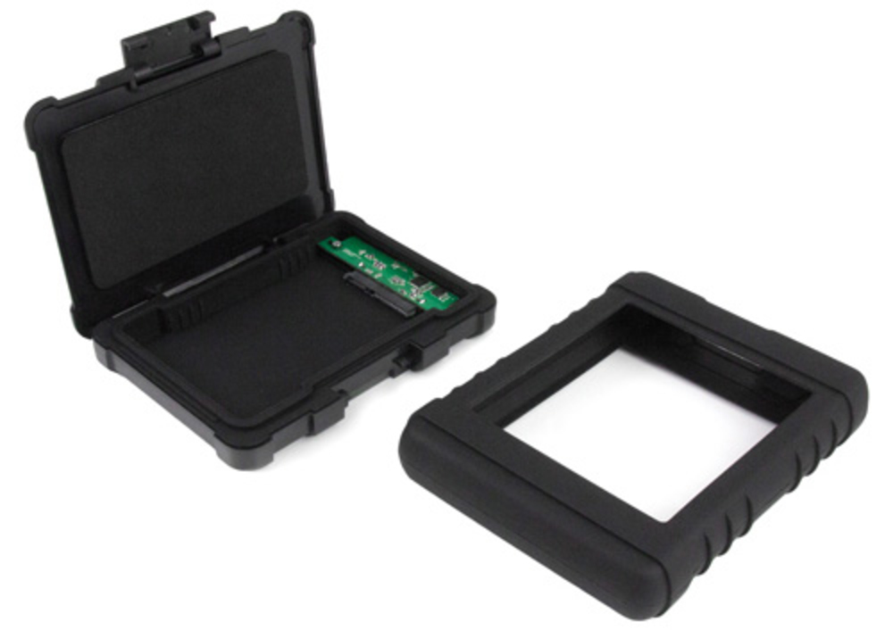 Questo resistente box esterno per unità è avvolto in una custodia protettiva in silicone ed è progettato per consentire la protezione delle unità da urti, vibrazioni e cadute accidentali e impreviste. È di categoria militare MIL-STD-810G ed è stato sottoposto ad una prova di caduta da 4 metri. È stato sottoposto a tale prova di caduta utilizzando un'unità a stato solido nel box esterno.