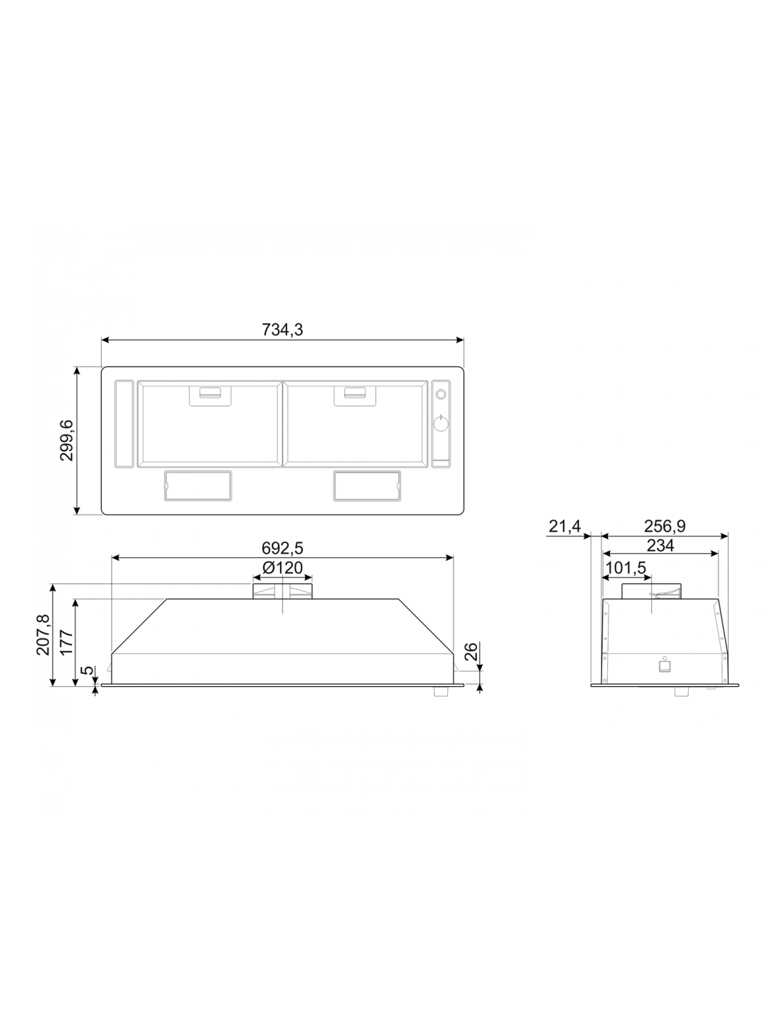 Smeg KSG70E. Potenza massima di estrazione: 224 m³/h, Classe di efficienza dinamica del fluido: E, Classe di efficienza luminosa: D. Tipo: Integrato, Colore del prodotto: Argento, Potenza lampadina: 3 W. Tipo di filtro antigrasso: Alluminio, Numero di filtri: 2 pz. Classe efficienza energetica: C, Consumo energetico annuo: 50 kWh, Carico di collegamento: 81 W. Larghezza: 734,3 mm, Profondità: 299,6 mm, Altezza (min.): 17,7 cm