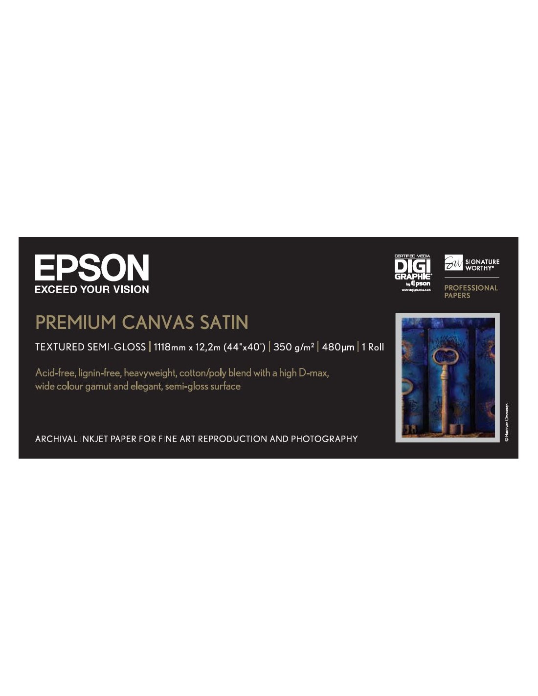 Che si tratti di ritratti fotografici o di riproduzioni artistiche, Premium Canvas Satin soddisfa anche i professionisti più esigenti, garantendo sia elevata qualità delle immagini che maggiori opportunità creative. Composta al 65% di poliestere e al 35% di cotone, questa pesante e resistente tela di qualità, unica nel suo genere, è realizzata a trama fitta 2:1 ed è dunque ideale per riproduzioni artistiche e fotografiche. È caratterizzata da una patinatura ad alta risoluzione, abbastanza elastica da resistere a eventuali sollecitazioni senza cedere, e da una superficie finemente strutturata che garantisce un autentico effetto artistico. Ad una straordinaria riproduzione dei colori, Premium Canvas Satin abbina una superficie particolarmente lucida, velocità di asciugatura e resistenza all'acqua, qualità che la rendono perfetta per tutte le applicazioni che richiedono immagini di elevata qualità e per le quali è prevista un'esposizione prolungata. Dal momento che tutti i colori, pigmenti e tutte le carte si alterano con il tempo, Epson non può offrire garanzie per questo prodotto per quanto riguarda l'alterazione di colori o lo sbiadimento. La responsabilità di Epson per tutti i difetti di produzione e imballaggio è limitata alla sola sostituzione di questo prodotto. Le caratteristiche tecniche possono essere modificate senza previa comunicazione.Questa carta è stata certificata per la digigrafia e testata da laboratori indipendenti, così da garantire la stabilità delle stampe nel tempo. La lista completa di carte certificate per la digigrafia è disponibile sul sito www.digigraphie.com.