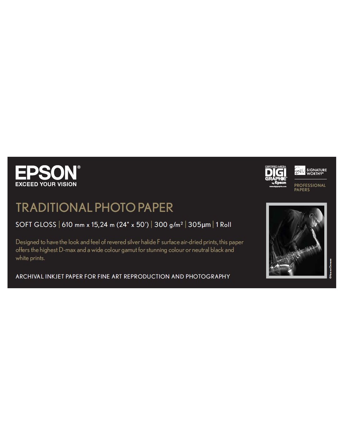 Epson Traditional Photo Paper è una carta fotografica innovativa. È stata ideata in esclusiva per l'utilizzo con gli inchiostri Epson UltraChrome K3, in collaborazione con molti dei migliori fotografi professionisti del settore, affinché la carta potesse soddisfare le loro elevate esigenze.Molti tra coloro che hanno contribuito allo sviluppo di Traditional Photo Paper si sono resi conto che questa carta ricorda i pregiati supporti all'alogenuro d'argento e inoltre offre un elevato controllo creativo, grazie ad uno straordinario valore D-Max e alla fedele resa dei toni in bianco e nero. Inoltre potete stampare colori eccezionali sulla stessa carta, cosa che non era possibile con le tradizionali carte a base di fibre.Unendo l'arte della fotografia tradizionale con la semplicità e il controllo della stampa digitale, questo straordinario supporto offre gli stessi profondi toni di nero, le delicate gradazioni tonali e i risultati durevoli delle tradizionali carte da camera oscura. La sua base in fibra offre una superficie ricca, profondità di colore uniforme e una morbida lucentezza, qualità ideali per una straordinaria resa a colori o stampe neutre in bianco e nero che conservano l'aspetto e l'effetto delle tradizionali carte in fibra.Come tutti gli innovativi supporti Epson, anche questa carta è stata ideata per ottenere la più alta risoluzione e la migliore saturazione del colore possibili. Come sempre, i materiali di consumo Epson garantiscono assoluta qualità.