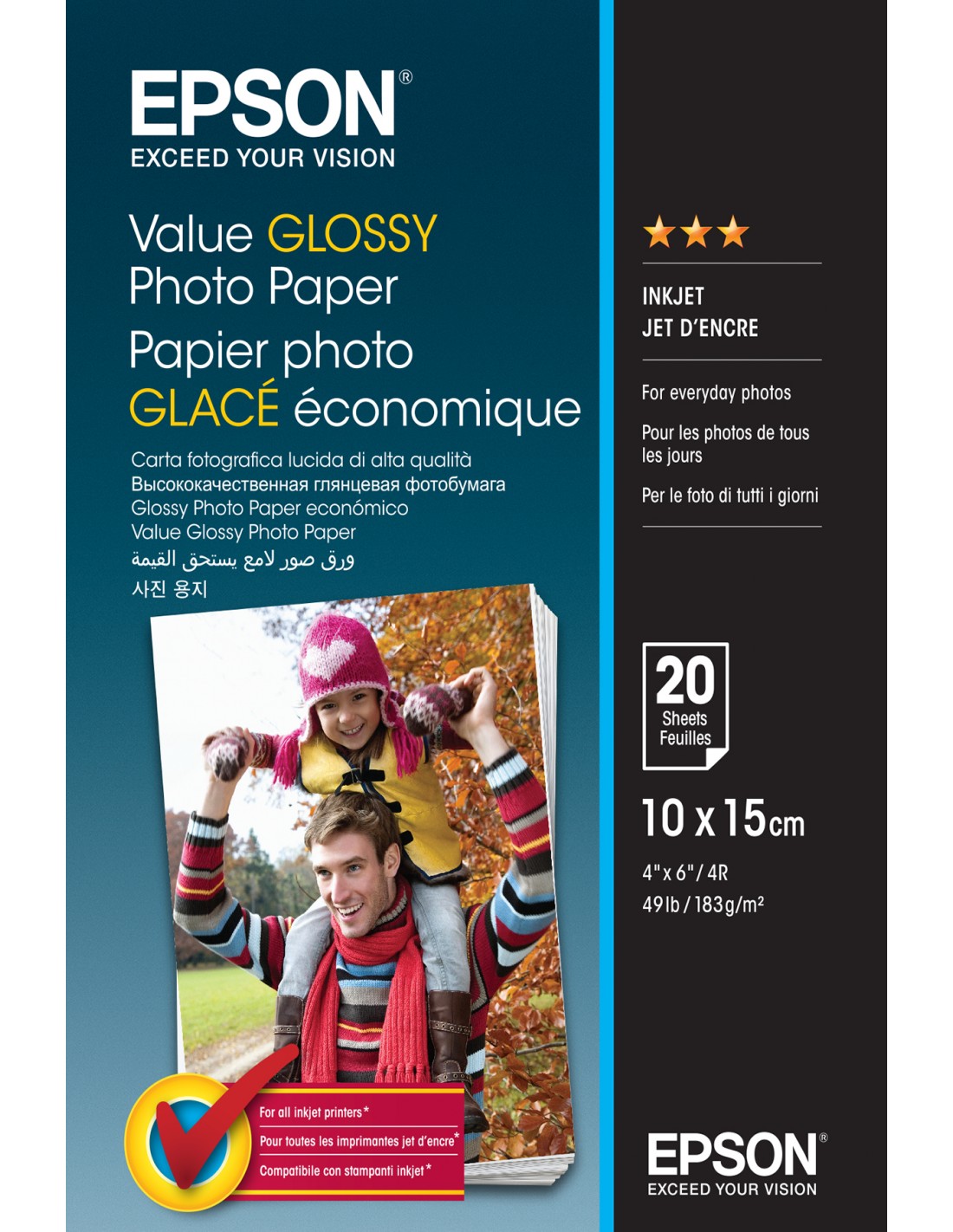 Epson offre una gamma di carte fotografiche, per garantire il prodotto giusto al prezzo giusto in ogni situazione. La nuova carta fotografica lucida Value a tre stelle da 183 gsm è il prodotto entry-level della gamma Epson. Per coloro che sono alla ricerca di qualità professionale da archivio, Epson offre la carta fotografica lucida a quattro stelle da 200 gsm con rivestimento in resina, la carta fotografica lucida Premium a cinque stelle da 255 gsm e la carta fotografica lucida “Ultra” a cinque stelle + da 300 gsm.