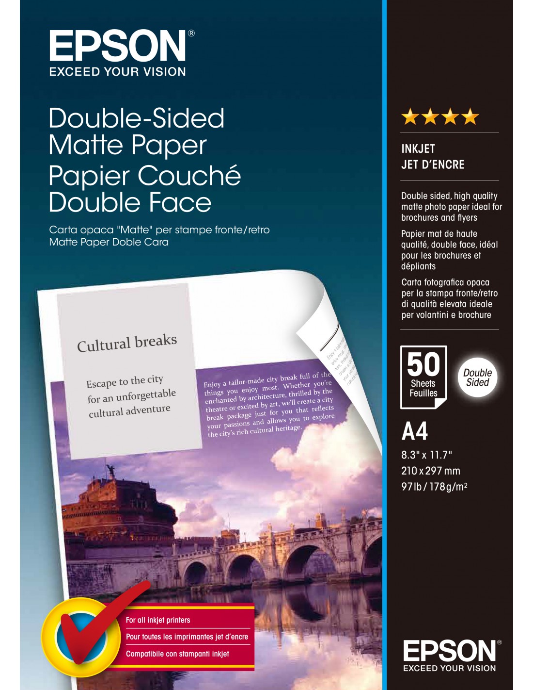 Epson Double-Sided Matte Paper - A4 - 50 Fogli. Colore del prodotto: Bianco, Tipo rifinitura: Opaco, Peso medio: 178 g/m². Quantità per pacco: 1 pezzo(i), Larghezza imballo: 220 mm, Profondità imballo: 300 mm. Pallet width (UK): 100 cm, Pallet length (UK): 120 cm, Pallet height (UK): 100 cm. Paese di origine: Giappone