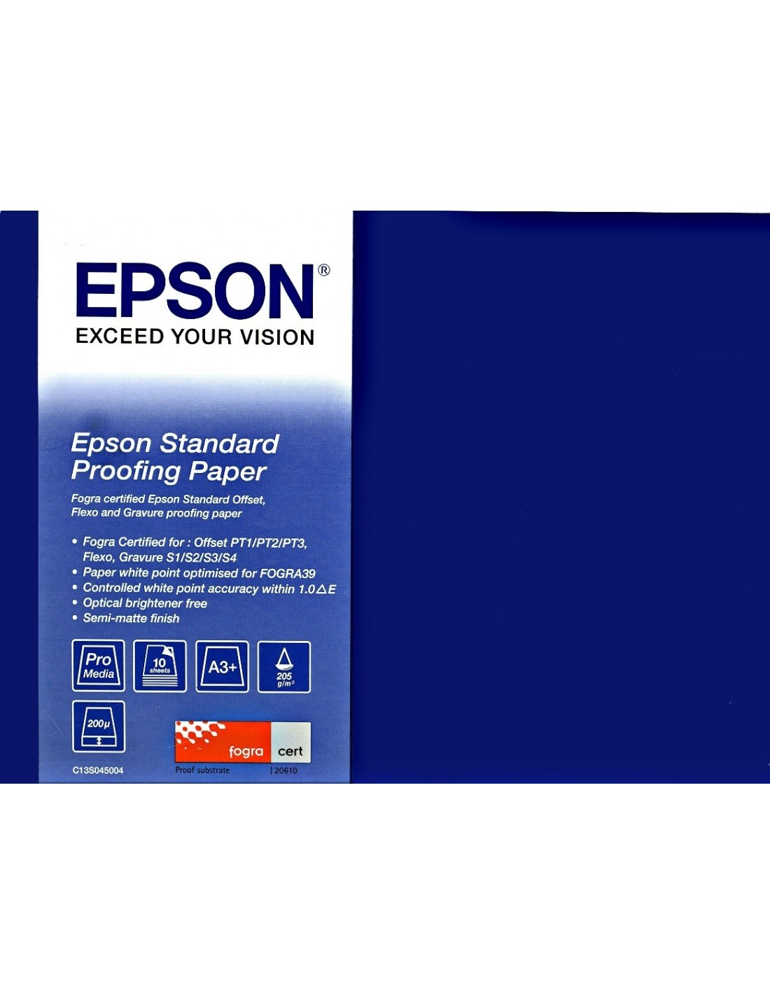 La carta Standard Proofing Paper dispone di una certificazione Fogra 39, destinata a diventare standard europeo. Con il più ampio spazio colore disponibile per la riproduzione precisa dei colori, questa carta offre colore, grammatura e grado di brillantezza concepiti per l'utilizzo in applicazioni industriali di stampa offset, dove la resa dei colori è di fondamentale importanza. Ottimizzato per prove di stampa, questo supporto fornisce un'eccezionale stabilità a breve termine se utilizzato con i nostri inchiostri Epson UltraChrome K3 con Vivid Magenta.Come tutti gli innovativi supporti Epson, anche questa carta è stata ideata per ottenere la più alta risoluzione e la migliore saturazione del colore possibili. Come sempre, i materiali di consumo Epson garantiscono la qualità Epson.Panoramica- Certificazione FOGRA per offset PT1/PT2/PT3, Flexo, incisioni S1/S2/S3/S4- Punto del bianco 95, 0 -2 ottimizzato per FOGRA39- Precisione del punto del bianco controllata inferiore a Δ E 1.0- Priva di sbiancanti ottici- 205 g/m², 200 micrometri- Finitura semi-opaca- Ad asciugatura immediata