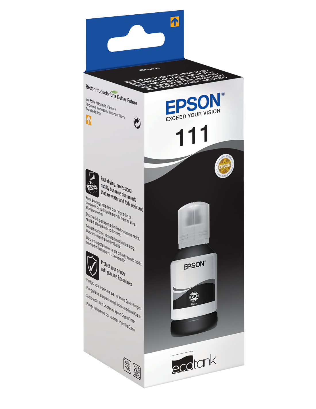 Epson 111 EcoTank Pigment black ink bottle. Tipo: Originale, Tipo di inchiostro: Inchiostro colorato, Colori di stampa: Nero. Larghezza imballo: 59 mm, Profondità imballo: 155 mm, Altezza imballo: 59 mm. Larghezza scatola principale: 30,5 cm, Lunghezza del cartone principale: 47,8 cm, Altezza scatola principale: 14,1 cm