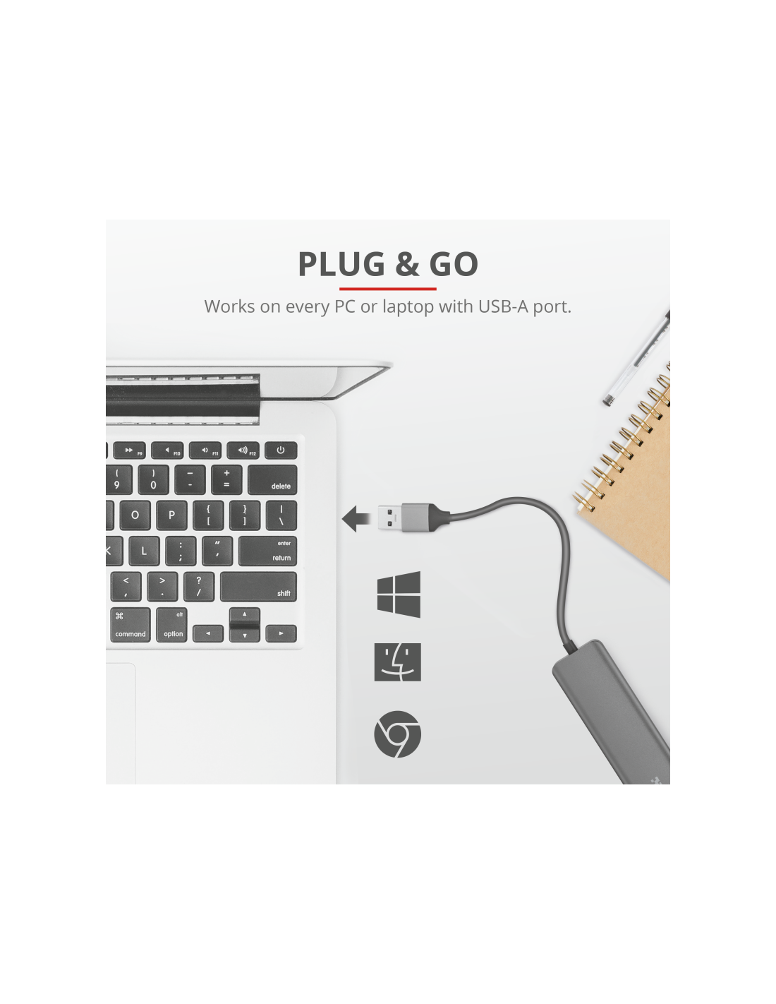 Questo hub resistente e raffinato in alluminio si può inserire in qualsiasi borsa o tasca e non richiede alcuna spina di corrente. È sufficiente inserire la sua spina nel computer o laptop perché funzioni immediatamente. Con un solo dispositivo sottile e compatto, si avrà a disposizione la soluzione perfetta per collegare tutti i dispositivi e le periferiche.