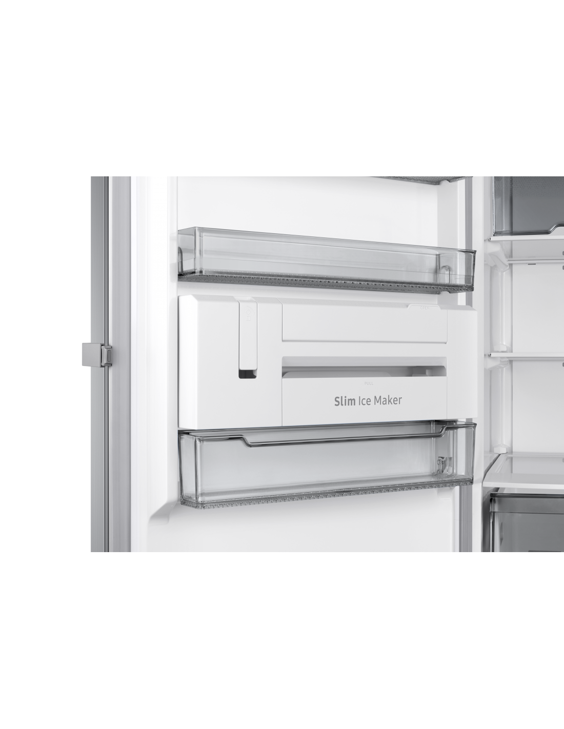 La macchina del ghiaccio Slim, integrata nella porta, ti permette di avere ancora più spazio libero sugli scaffali. Non preoccuparti, non rimarrai a corto di ghiaccio; la macchina del ghiaccio Slim può conservare fino a 5 volte la quantità di ghiaccio che produce, ti basterà girare una manopola per avere sempre dei cubetti di ghiaccio a tua disposizione.