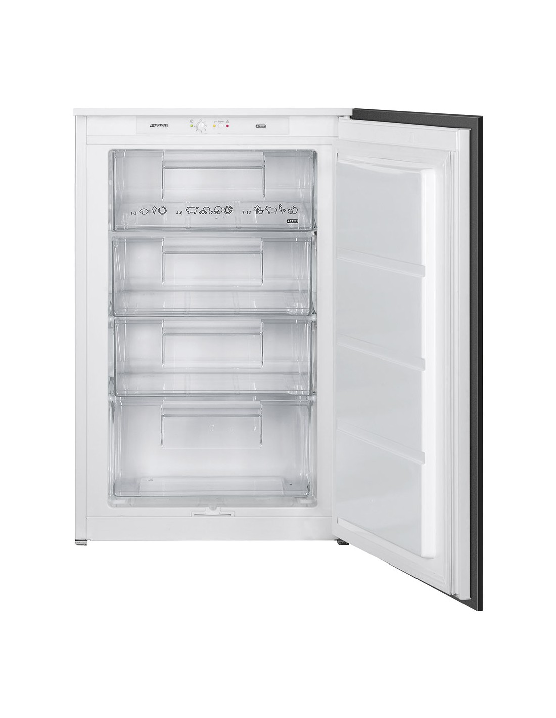 Smeg S4F094E. Capacità netta congelatore: 98 L, Classe climatica: ST-T, Capacità di congelamento: 10 kg/24h, Autonomia senza energia elettrica: 20 h, Emissione acustica: 34 dB, Punteggio: 4*. Cerniera porta: Destra. Classe efficienza energetica: E, Consumo energetico annuo: 157 kWh. Colore del prodotto: Bianco
