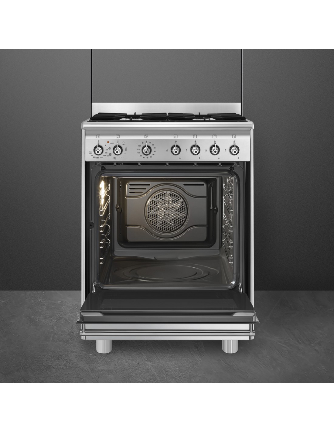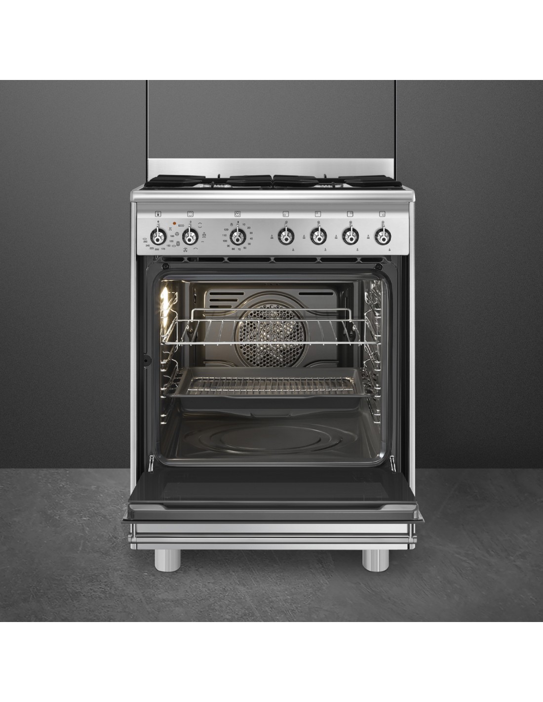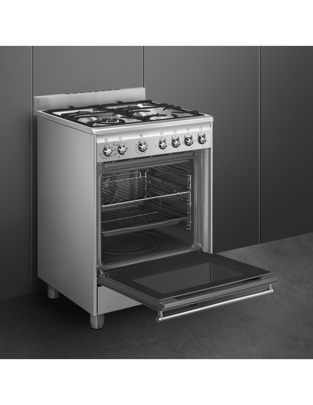 Smeg SX61GM. Tipo di prodotto: Cucina, Colore del prodotto: Acciaio inox, Tipo di controllo: Manopola. Tipo di piano cottura: Gas, Numero totale di fuochi: 4 Fornello(i), Numero di fuochi: 4 Fornello(i). Dimensione del forno: Media, Sorgente di alimentazione del forno: Gas, Capacità netta del forno: 70 L. Classe efficienza energetica: A, Consumo energetico (convenzionale): 0,99 kWh, Consumo energetico (convezione forzata): 0,8 kWh. Tecnologie Smeg (cottura): Vapour Clean