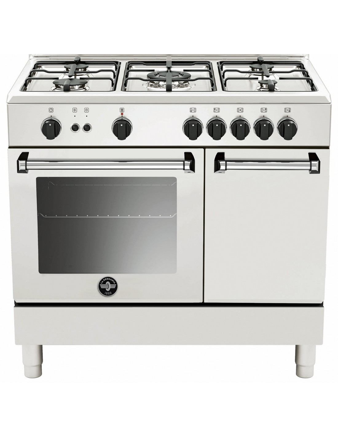 Bertazzoni La Germania Americana AMN9P5GBV/24. Tipo di prodotto: Cucina, Colore del prodotto: Bianco, Tipo di controllo: Manopola. Tipo di piano cottura: Gas, Numero totale di fuochi: 5 Fornello(i), Numero di fuochi: 5 Fornello(i). Dimensione del forno: Media, Sorgente di alimentazione del forno: Gas, Capacità netta del forno: 56 L. Classe efficienza energetica: A+, Consumo energetico (convenzionale): 1,3 kWh, Consumo energetico (convezione forzata): 1,49 kWh. Larghezza: 900 mm, Profondità: 600 mm