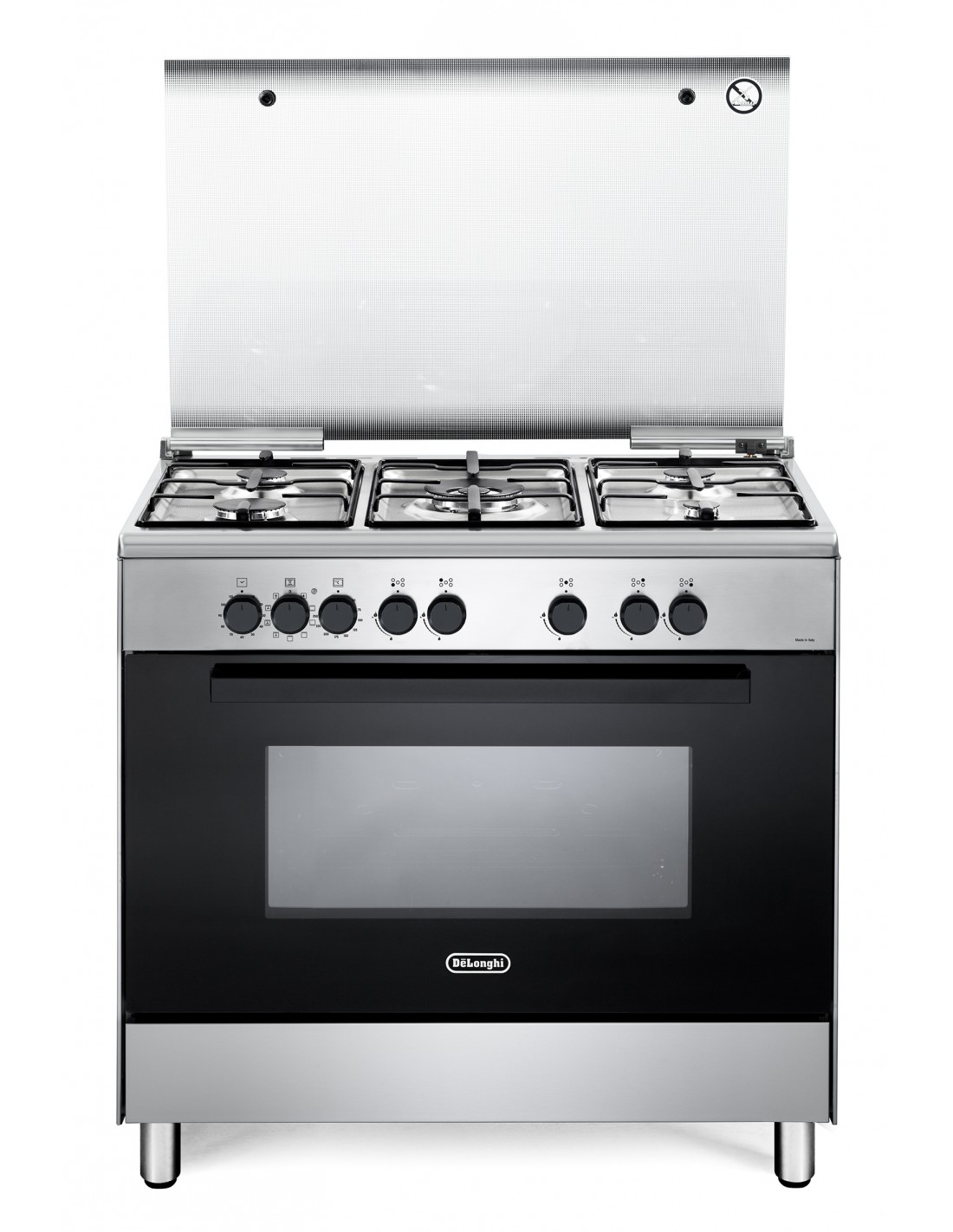 De’Longhi FMX 96 SG. Tipo di prodotto: Cucina, Colore del prodotto: Nero, Acciaio inox, Tipo di controllo: Manopola. Tipo di piano cottura: Gas, Numero totale di fuochi: 5 Fornello(i), Numero di fuochi: 5 Fornello(i). Dimensione del forno: Largo, Sorgente di alimentazione del forno: Elettrico, Capacità netta del forno: 83 L. Classe efficienza energetica: A, Consumo energetico (convenzionale): 1,09 kWh, Consumo energetico (convezione forzata): 0,86 kWh