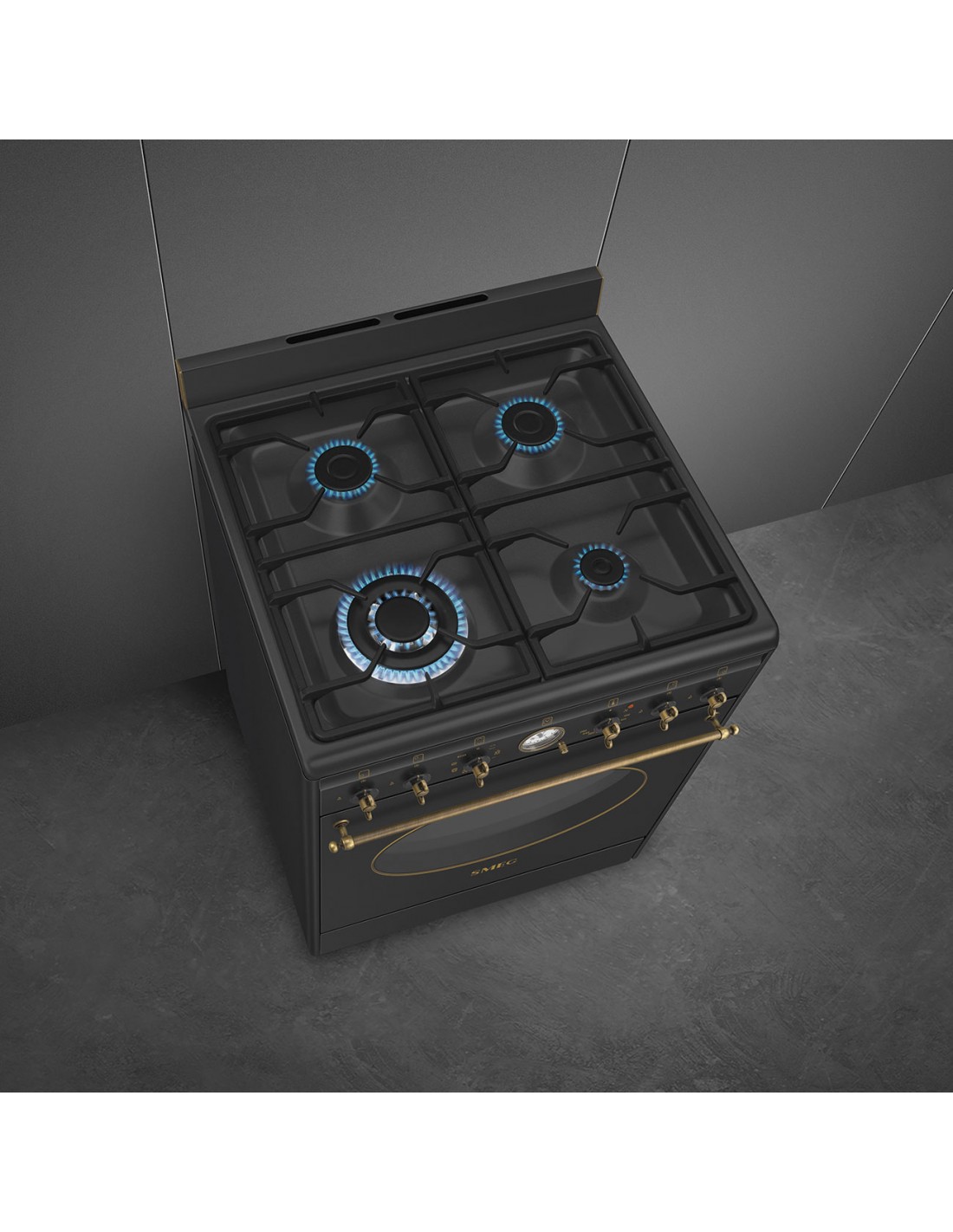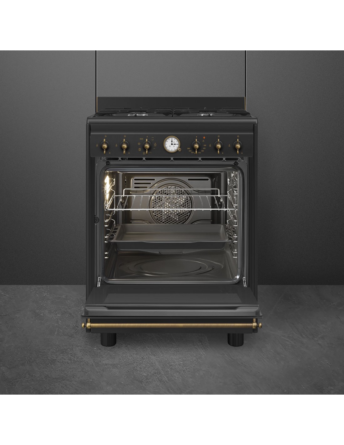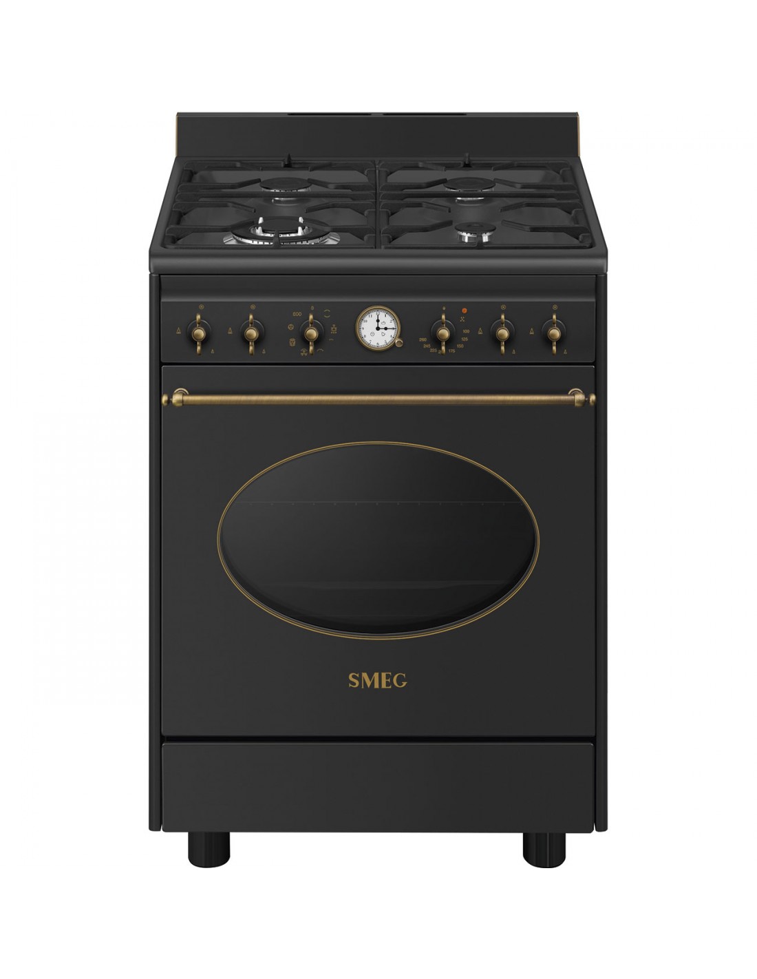 Smeg Coloniale CO60GMAN2. Tipo di prodotto: Cucina, Colore del prodotto: Nero, Tipo di controllo: Manopola. Tipo di piano cottura: Gas, Numero totale di fuochi: 4 Fornello(i), Numero di fuochi: 4 Fornello(i). Dimensione del forno: Media, Sorgente di alimentazione del forno: Elettrico, Capacità netta del forno: 70 L. Classe efficienza energetica: A, Consumo energetico (convenzionale): 0,99 kWh, Consumo energetico (convezione forzata): 0,8 kWh. Larghezza: 600 mm, Profondità: 600 mm, Altezza: 900 mm