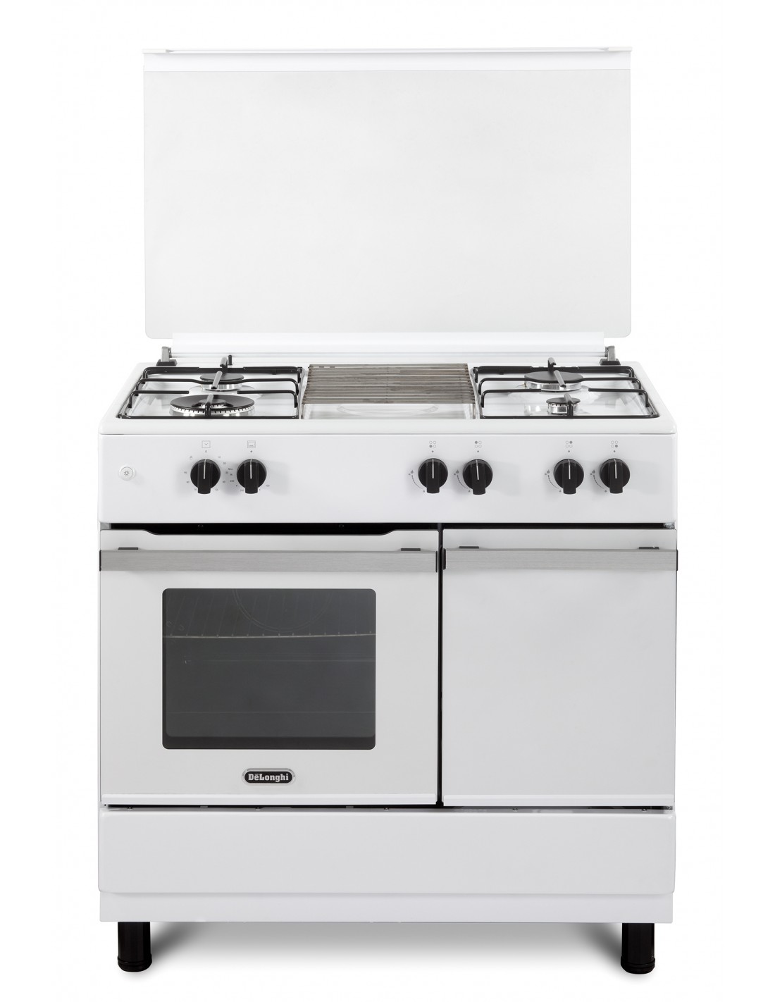 De’Longhi DL964GWB. Tipo di prodotto: Cucina, Colore del prodotto: Bianco, Tipo di controllo: Manopola. Tipo di piano cottura: Gas, Numero totale di fuochi: 4 Fornello(i), Tipo di accensione elettronica: Accensione con manopola. Dimensione del forno: Media, Sorgente di alimentazione del forno: Gas, Capacità netta del forno: 60 L. Tipo di timer del forno: Meccanico. Larghezza: 900 mm, Altezza: 869 mm, Altezza (min.): 84,4 cm