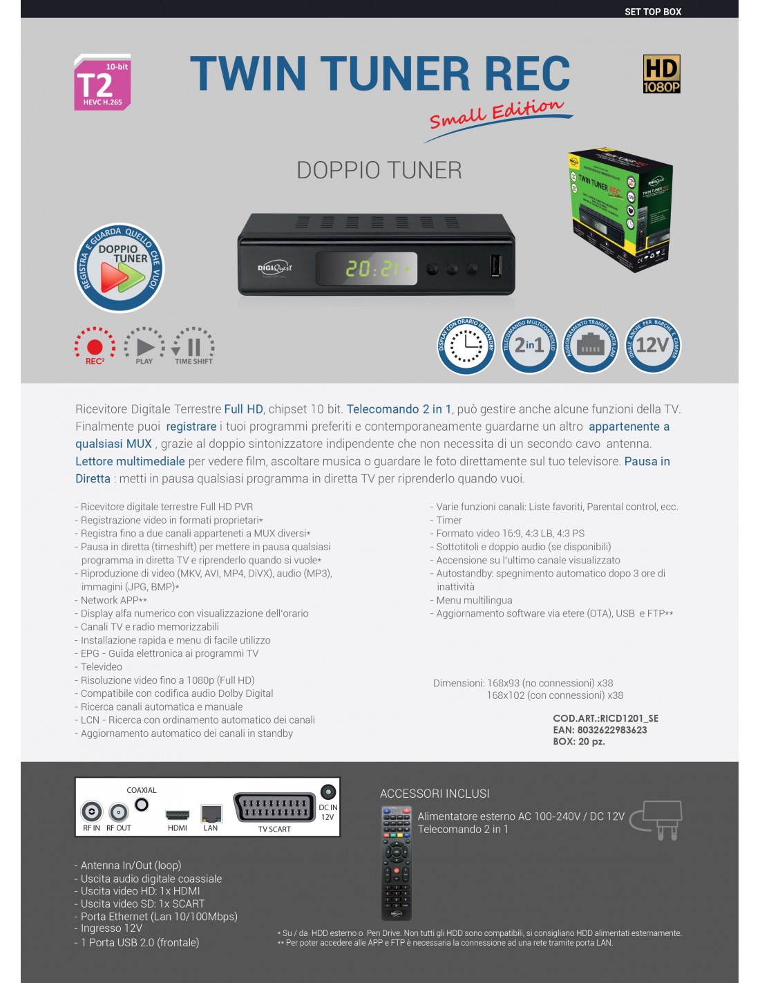 Ricevitore Digitale Terrestre Full HD, dalle dimensioni ridotte, chipset 10 bit. Telecomando 2 in 1, può gestire anche alcune funzioni della TV.
