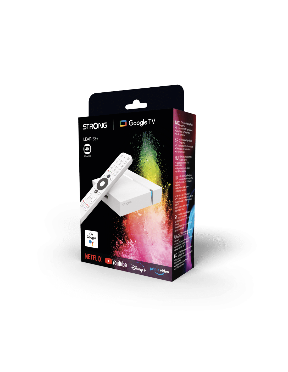 Strong LEAP-S3+. Produttore processore: Amlogic, Modello del processore: S905Y4, Frequenza del processore: 2 GHz. RAM installata: 2000 MB. Capacità memoria interna: 16 GB, Tipologia disco rigido: eMMC. Adattatore grafico: Mali G31-MP2. Sistema operativo incluso: Android, Applicazioni Video: Amazon Prime Video, Disney+, Netflix, YouTube