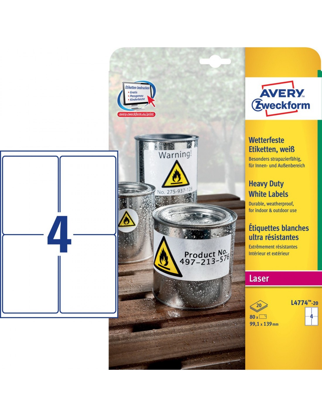 - Queste etichette non si strappano, resistono alle sostanze oleose, alla sporcizia e al grasso. Possono essere applicate su metallo, vetro, plastica, legno e a temperature estreme (da -20°C a +80°C).