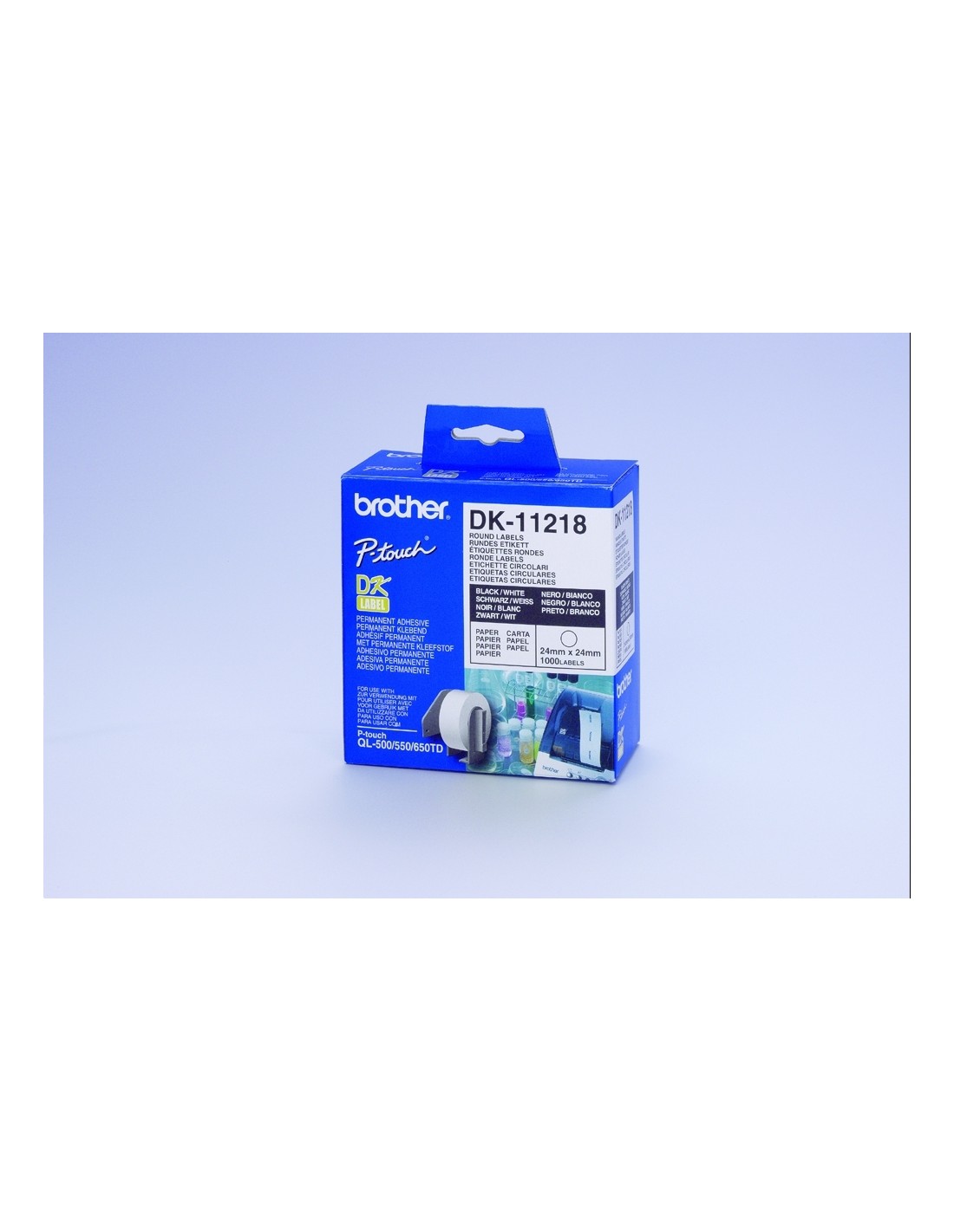 Brother DK-11218 Round Labels. Colore del prodotto: Bianco, Tipo etichetta: DK. Dimensione etichetta: Ø 24 mm. Etichette da pacchi: 1000 pezzo(i)