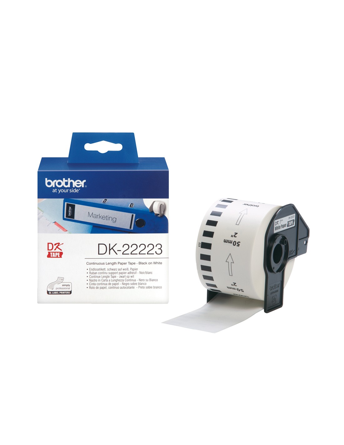 Brother DK-22223. Colore del prodotto: Bianco, Tipo etichetta: DK, Tecnologia di stampa: Trasferimento termico. Dimensione etichetta: 50 mm x 30.48m. Etichette da pacchi: 1 pezzo(i)