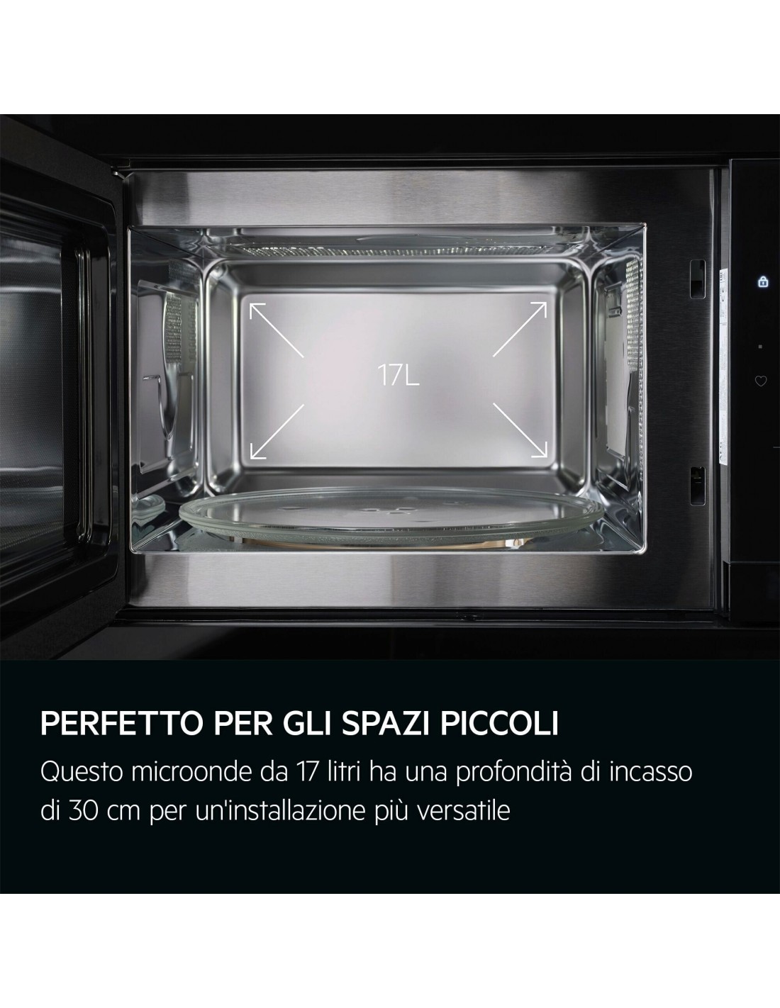 Questo forno a microonde da 17 litri ha una profondità di soli 30 cm. Ciò significa che può essere installato in molte posizioni, anche in cucine con armadi stretti sospesi a parete.