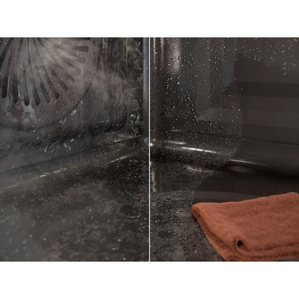 La pulizia a vapore segnala quando è il momento di pulire e rimuove facilmente lo sporco con un panno umido. Utilizzando il vapore per pulire le macchie, richiede fino al 95% di energia in meno rispetto alla pulizia per pirolisi.