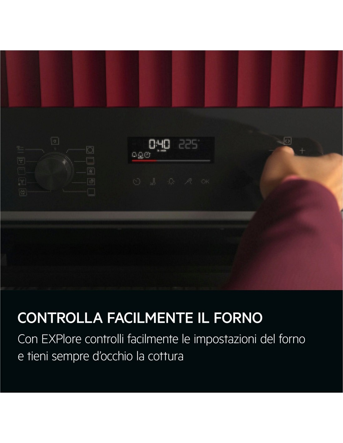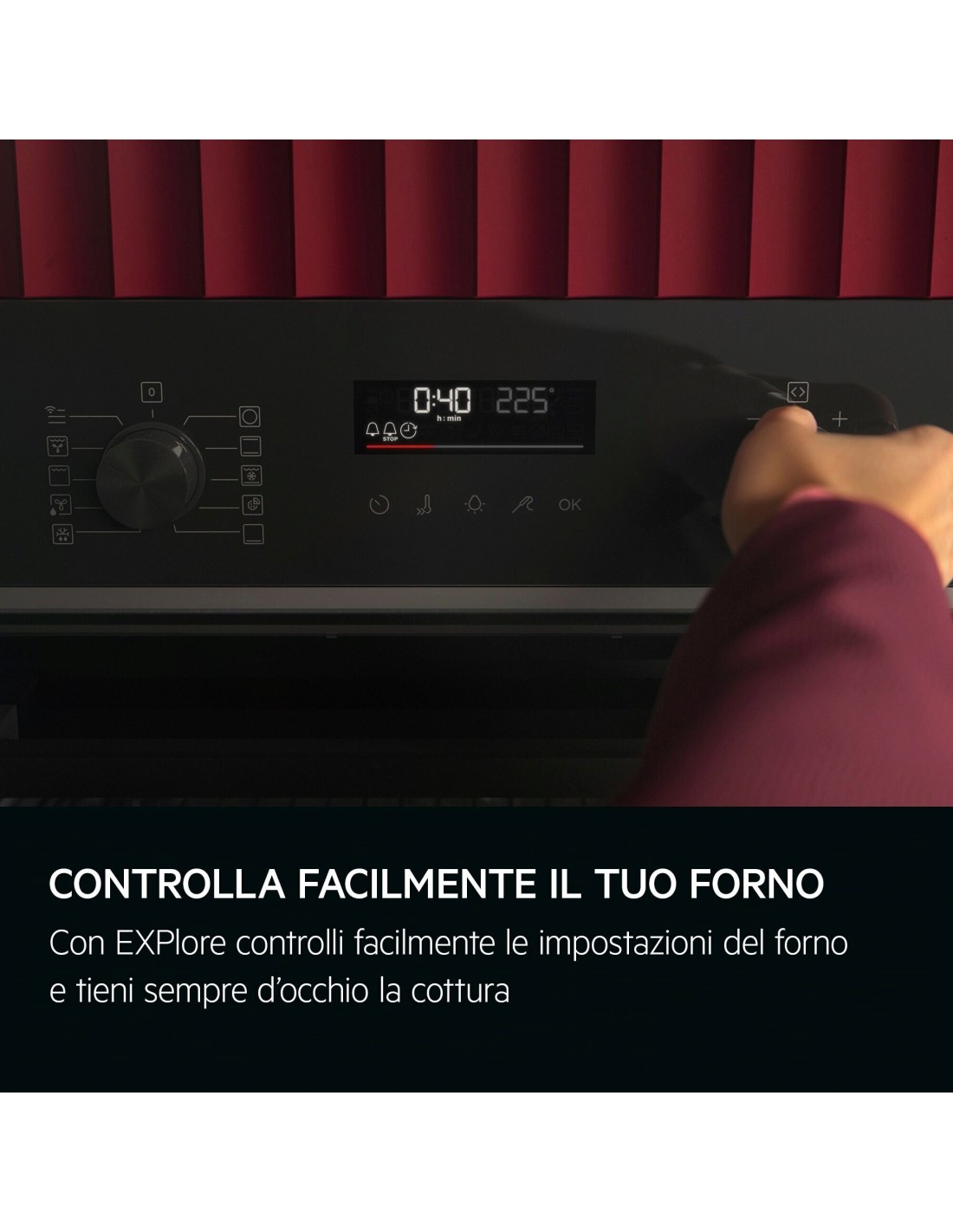 Il display EXPlore consente di controllare senza sforzo le impostazioni del forno e di sapere cosa sta succedendo durante la cottura. Grazie al display a LED e ai tasti touch, è possibile visualizzare facilmente l’ora, la temperatura e l’avanzamento del piatto.