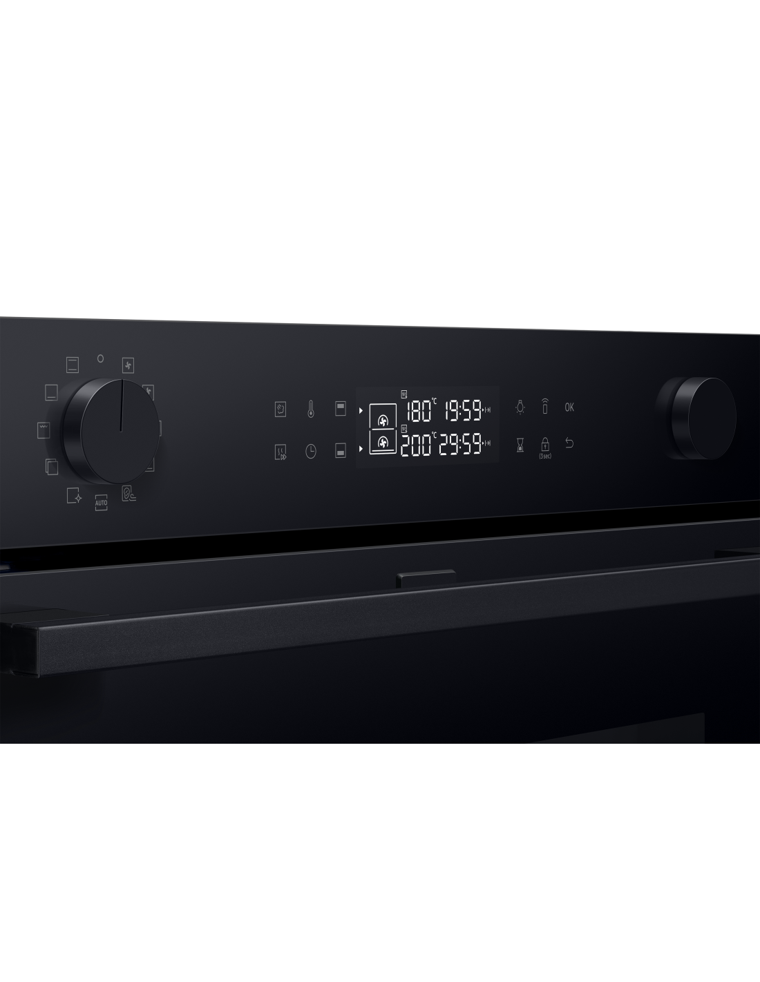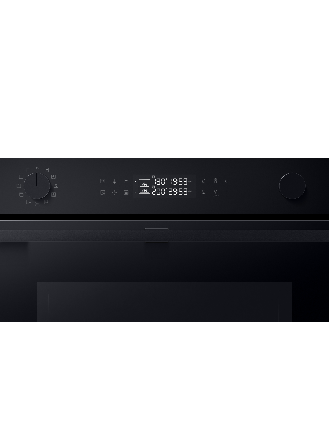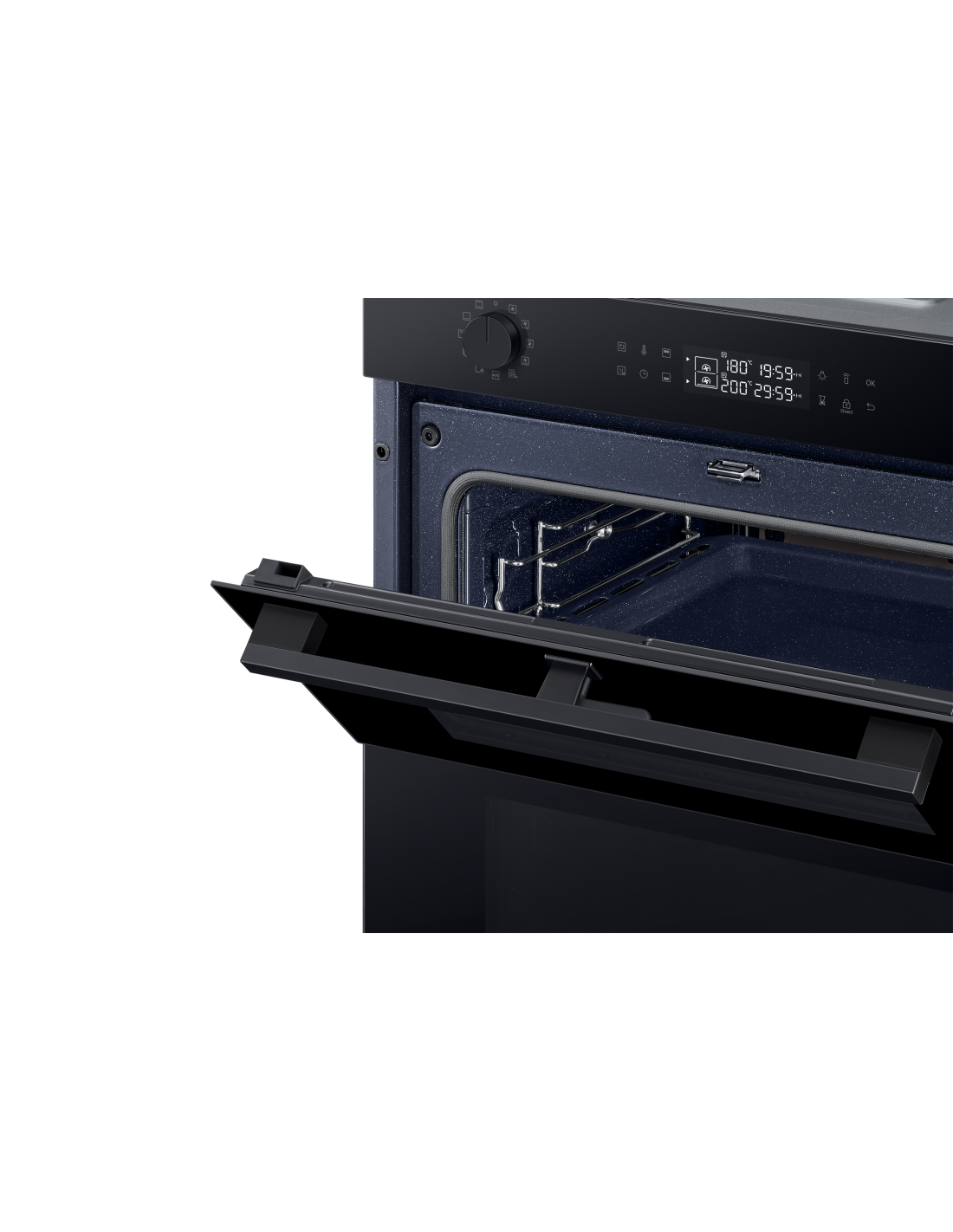 Prepara piatti diversi in modo più versatile ed efficiente. Le zone di cottura superiore e inferiore di Dual Cook Flex™ funzionano in modo indipendente. Utilizza la zona superiore per le pietanze più piccole, entrambe le zone con impostazioni diverse per temperatura e tempi di cottura, oppure l’intero forno per cibi voluminosi. Grazie alla doppia porta puoi accedere facilmente alla parte superiore.*Modello testato: NV7B5675LAK. * Consumo totale di energia ridotto del 25,3% e tempo di cottura ridotto del 22,7%, in base ai risultati di test condotti secondo il protocollo IEC-60350 (piccole torte, convezione a 165 ℃, in confronto all’intera cavità del forno). I risparmi effettivi variano a seconda dell’elemento di cottura, dell’uso e di altri fattori.