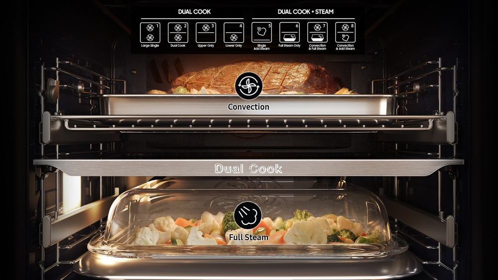 Prepara contemporaneamente piatti tradizionalmente e al vapore, o aggiungi il vapore per preservare l'umidità delle tue pietanze. Dual Cook Steam™ ti permette di preparare sane pietanze al vapore mentre cucini al forno altri piatti con impostazioni diverse. Puoi anche utilizzare la funzione Vapore regolabile durante la cottura di arrosti o prodotti da forno per ottenere piatti teneri e croccanti.* Disponibile solo su alcuni modelli.