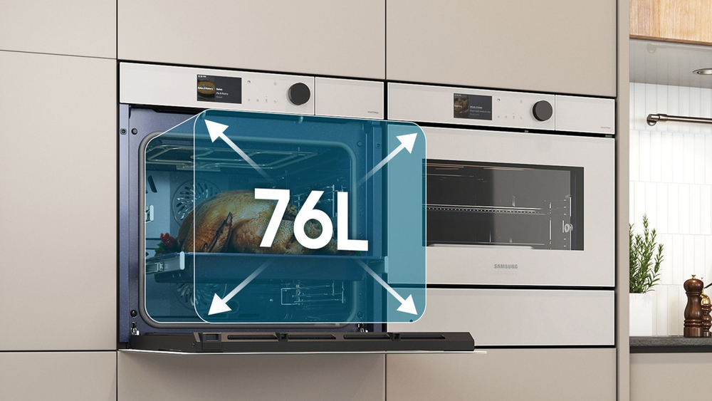 Cucina di più e più in grande grazie all’enorme capacità di 76 litri del forno. Offre molte più possibilità per la cucina casalinga. Puoi preparare insieme tante ricette diverse, ad esempio tutto il necessario per una festa. Oppure puoi cuocere cibi voluminosi, come un enorme tacchino per un pranzo di famiglia.