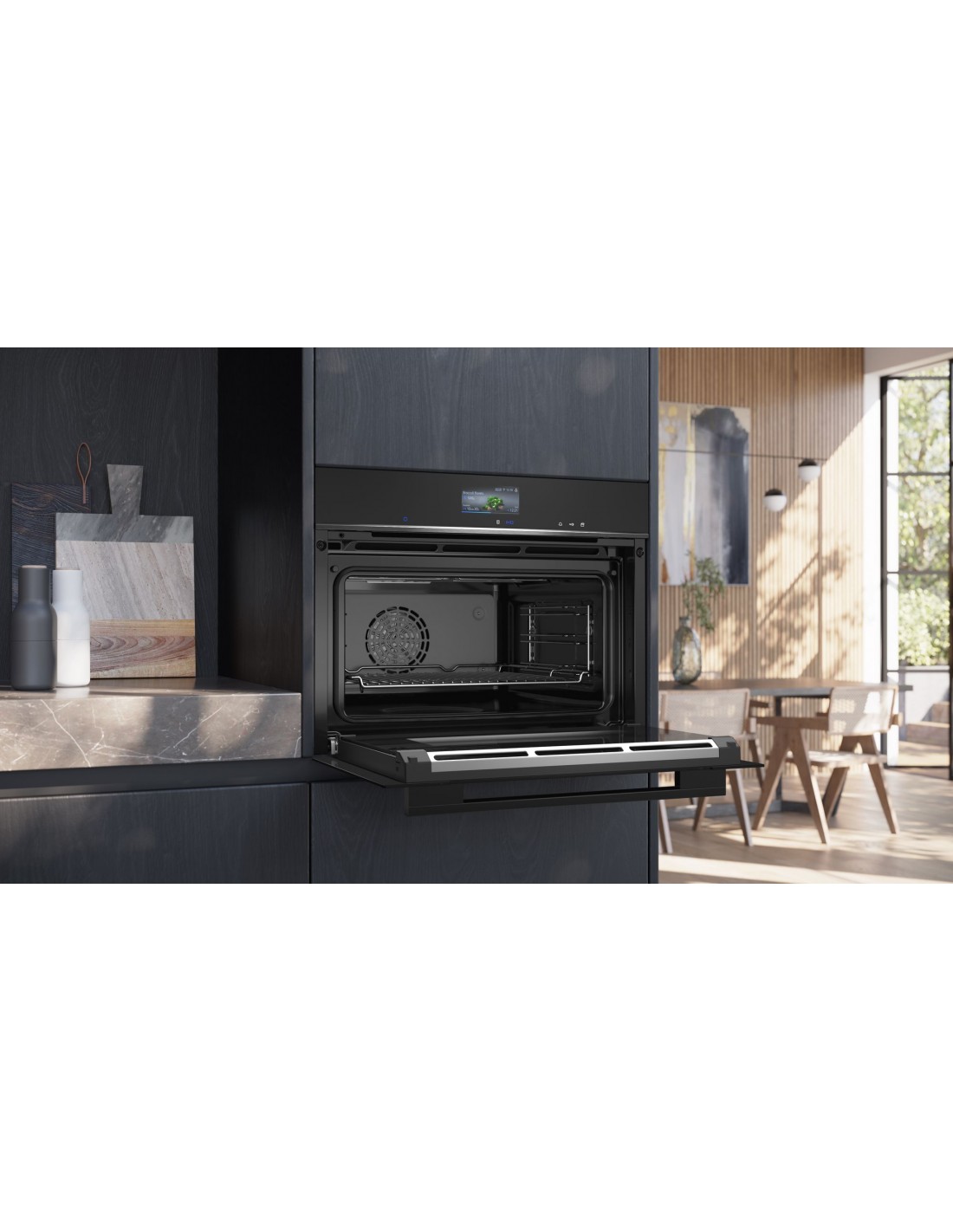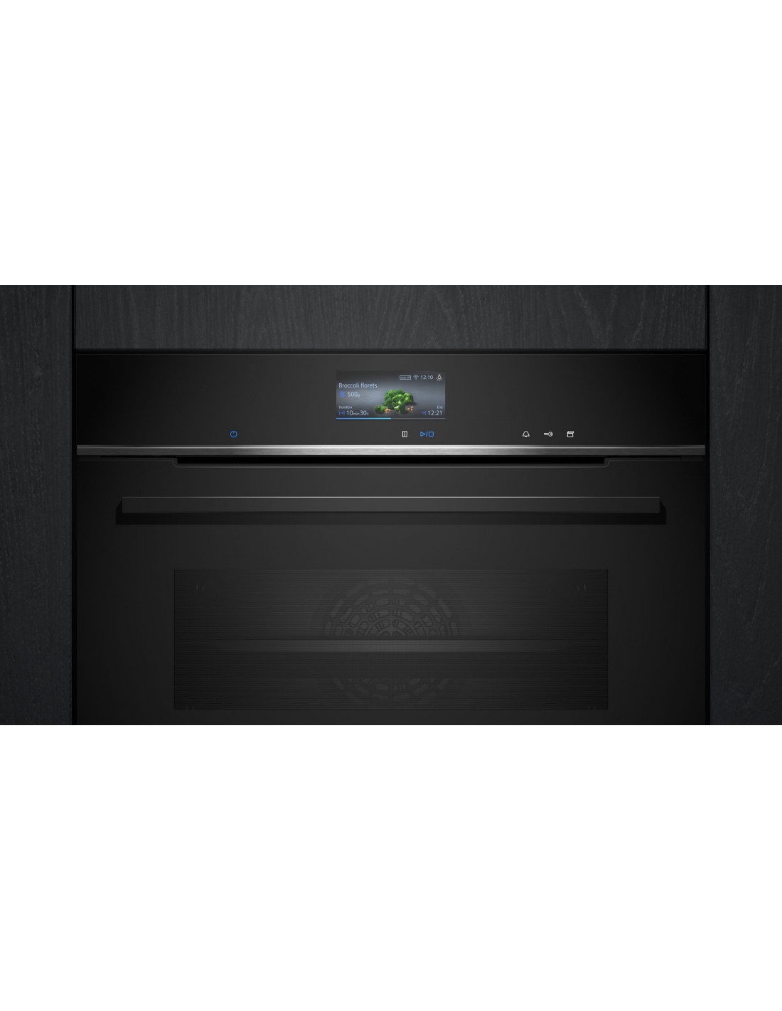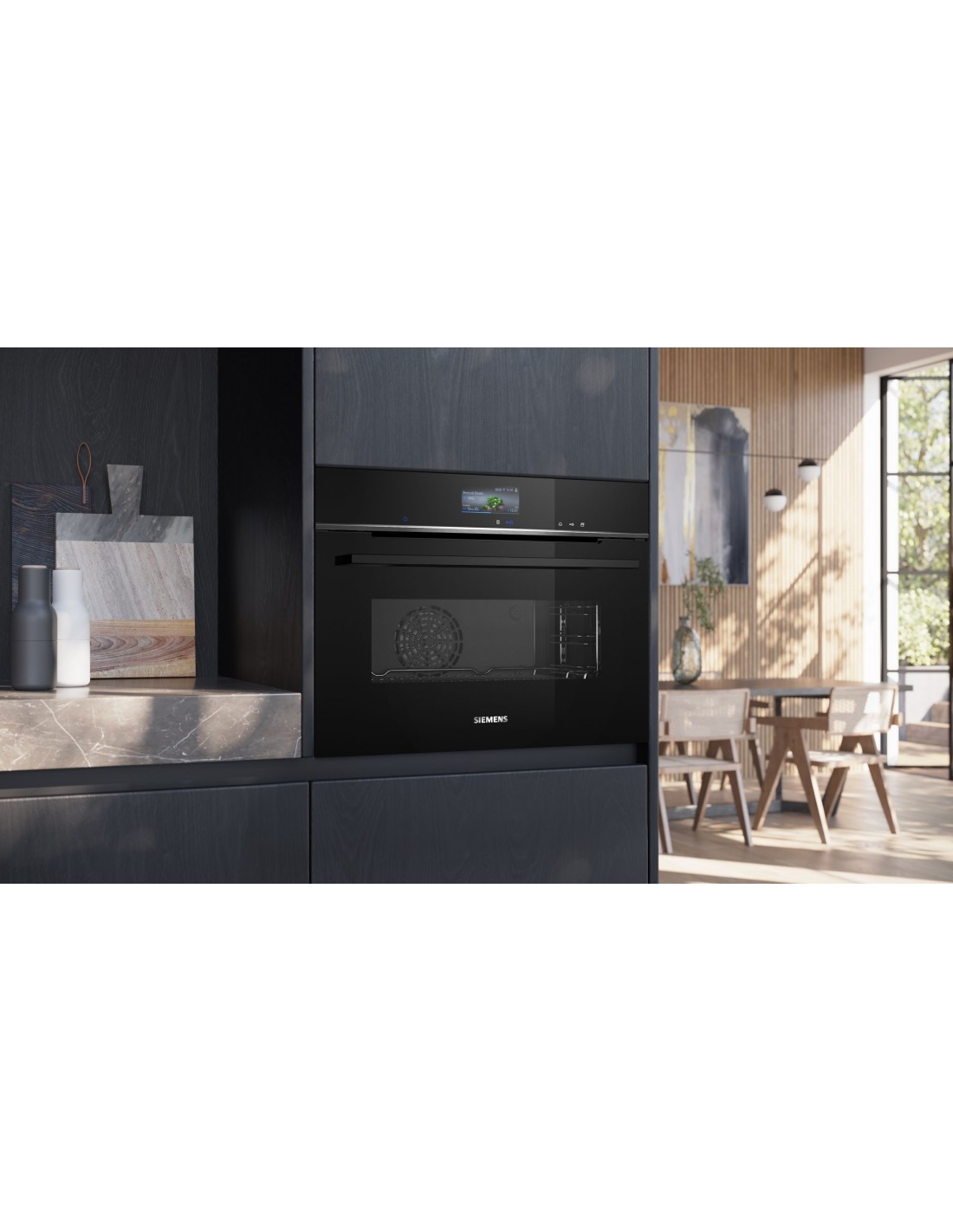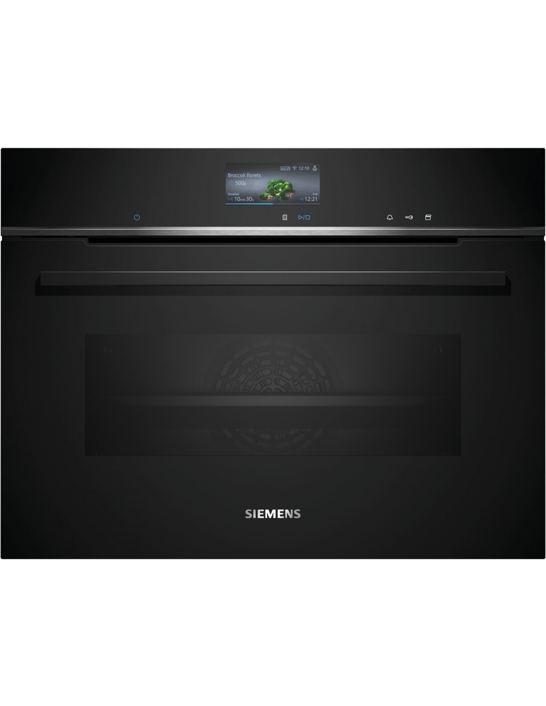 Siemens iQ700 CS736G1B1. Dimensione del forno: Media, Tipo di forno: Forno elettrico, Capacità interna forno totale: 47 L. Posizionamento dell'apparecchio: Da incasso, Colore del prodotto: Nero, Tipo di controllo: Touch. Tipo di orologio: Elettronico, Applicazioni per il controllo supportate: Home Connect. Consumo energetico (convenzionale): 0,73 kWh, Consumo energetico (convezione forzata): 0,61 kWh, Scala di efficienza energetica: Da A+++ a D. Tipo di lampada: LED