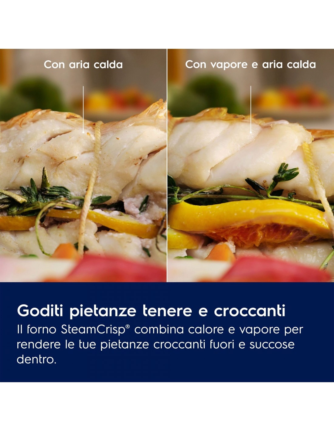 Il forno multifunzione SteamCrisp® combina calore e vapore per cuocere e arrostire. Questa combinazione mantiene i piatti croccanti all’esterno e succosi all’interno: la carne è più succosa e il pesce è più tenero, fino al 20% in più rispetto alla cottura in un forno non a vapore.