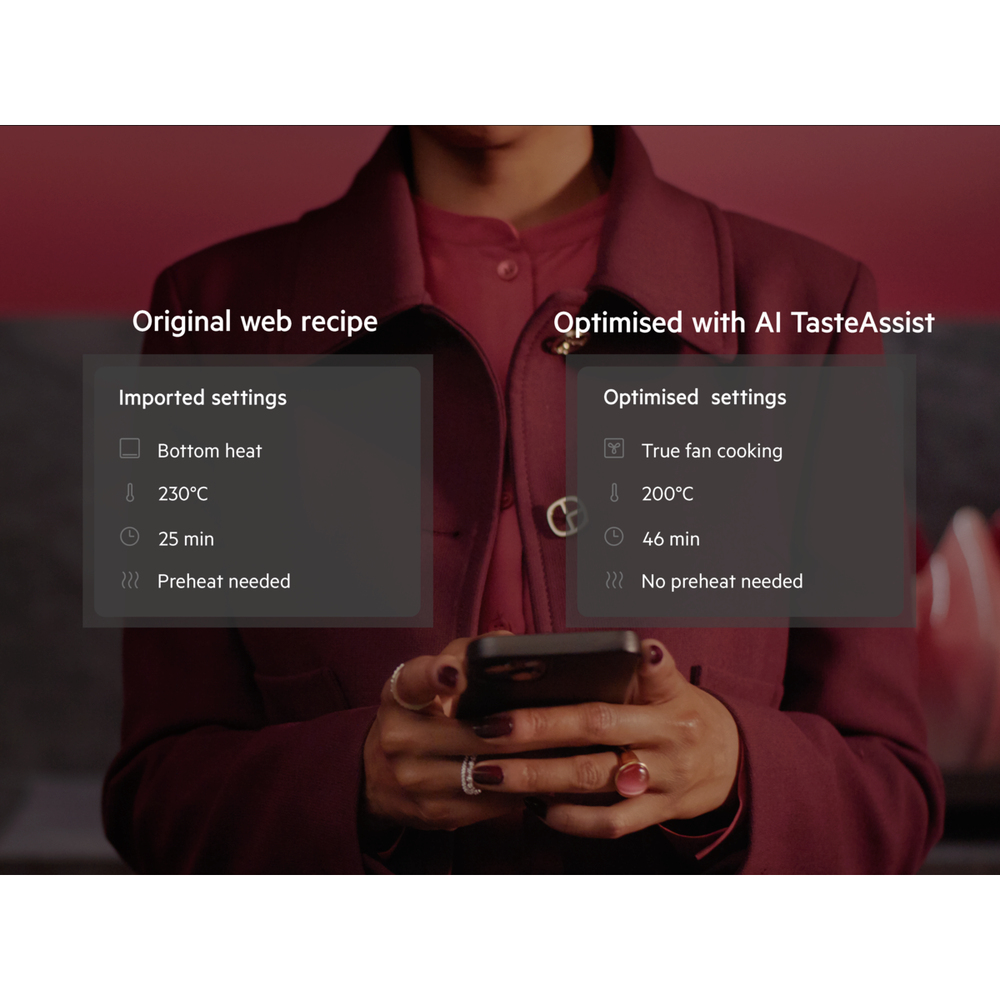 Elimina ogni dubbio e goditi tutte le funzionalità del tuo forno con AI TasteAssist. Invia semplicemente una ricetta web al tuo forno tramite la nostra app e lascia che l'intelligenza artificiale ottimizzi tempo, temperatura e funzioni, tirando fuori il meglio da ogni piatto.